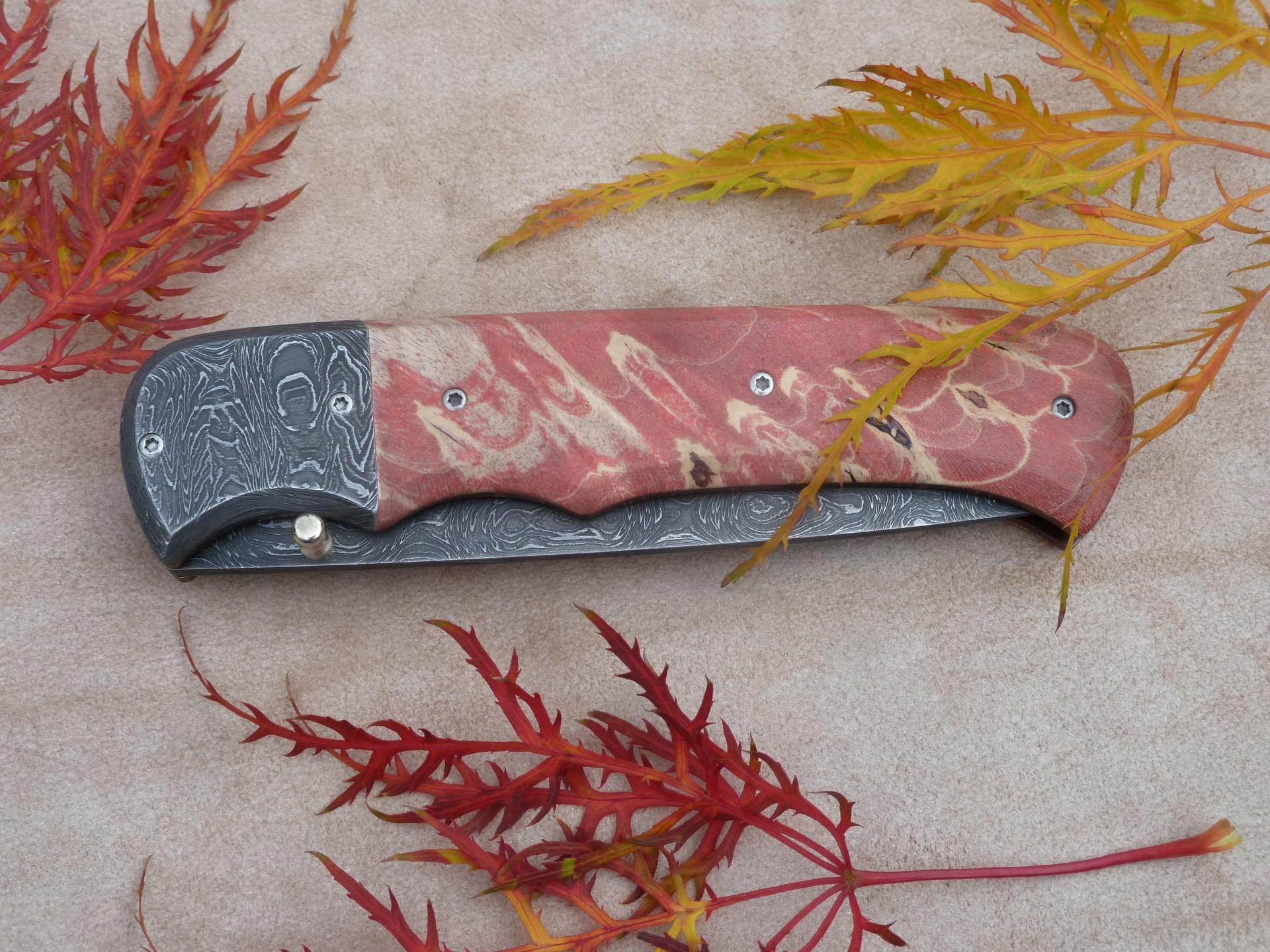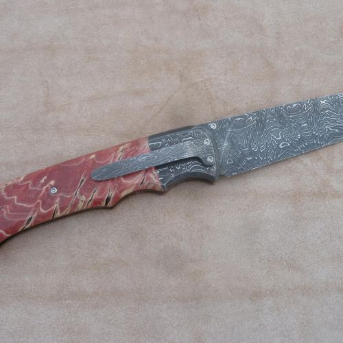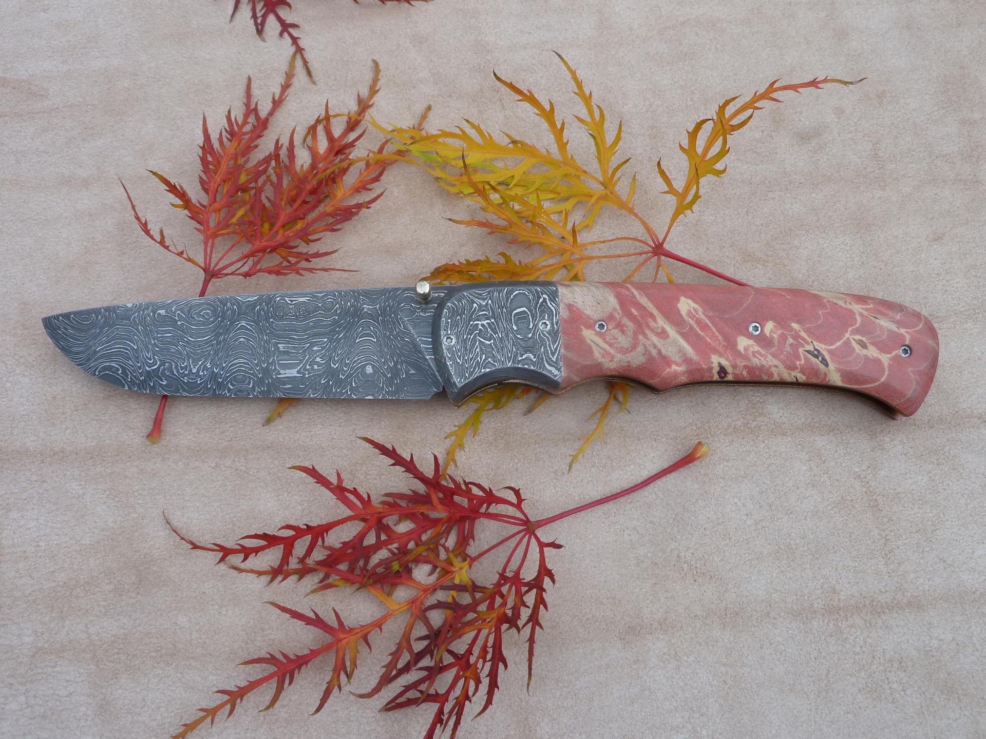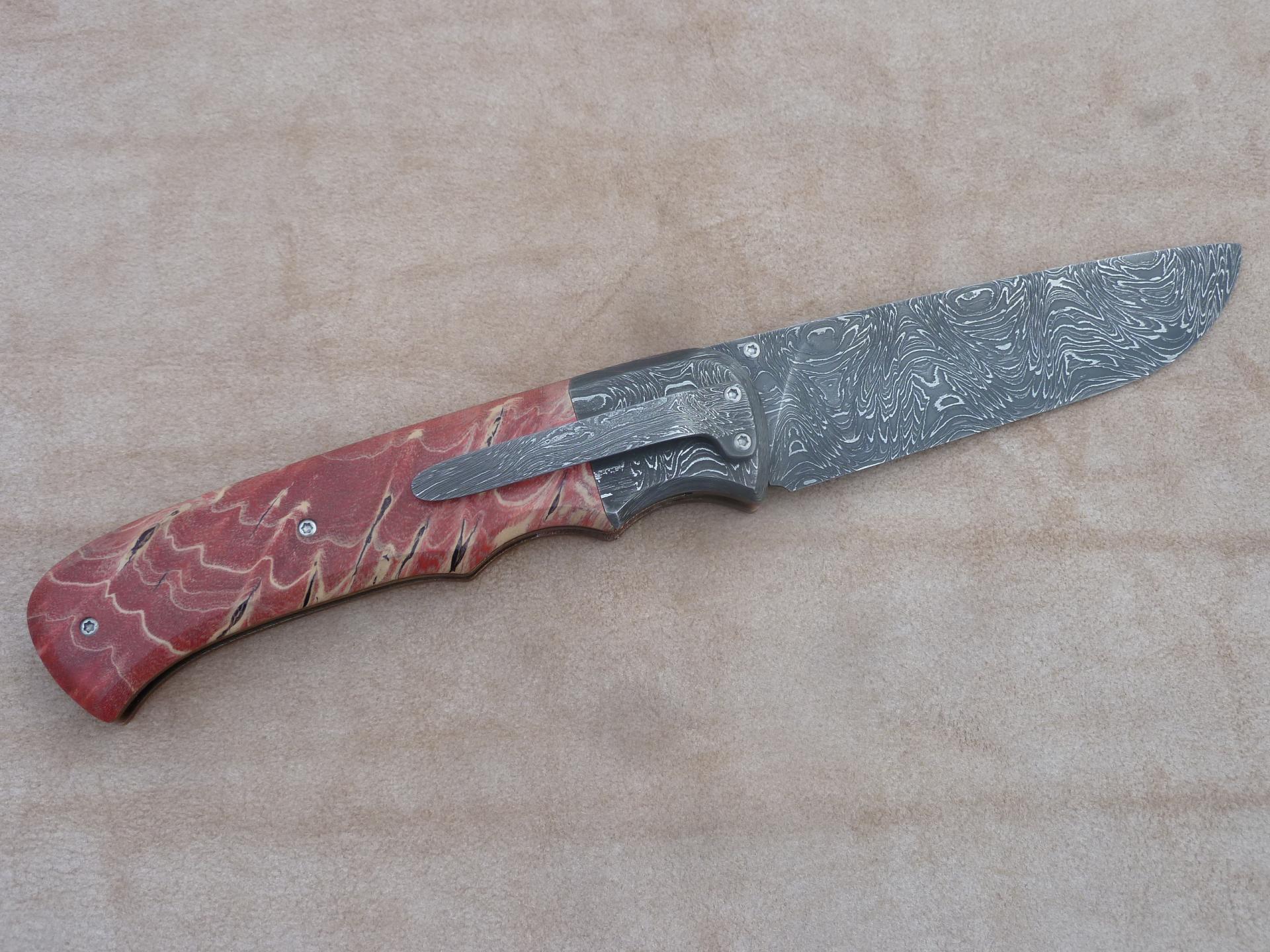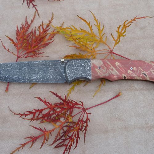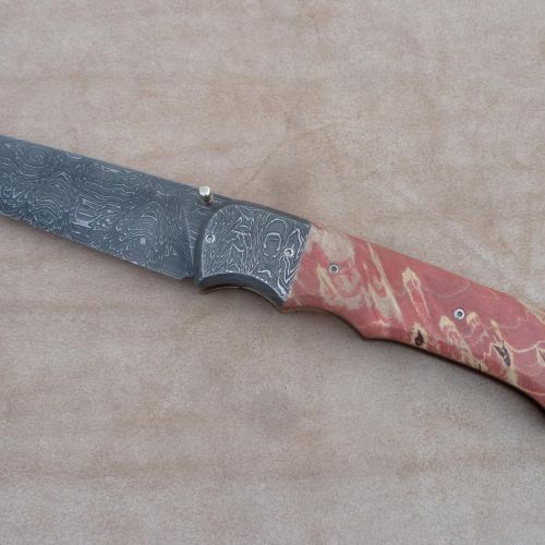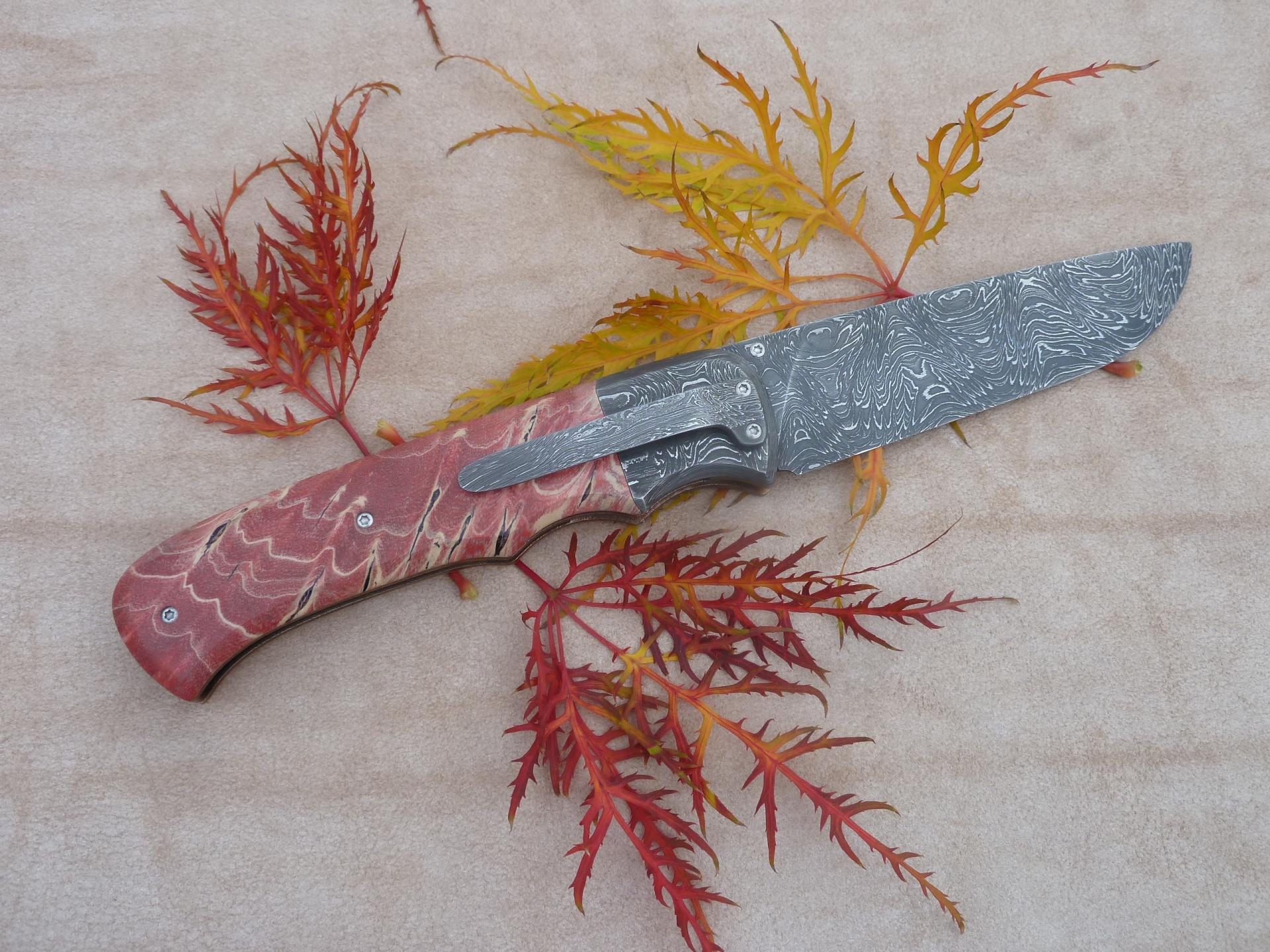 Čepel: damašek 95x3mm, bolstry i klip rovněž z damašku Rukojeť: příložky na rukojeti jsou ze stabilizovaného javoru Pouzdro: