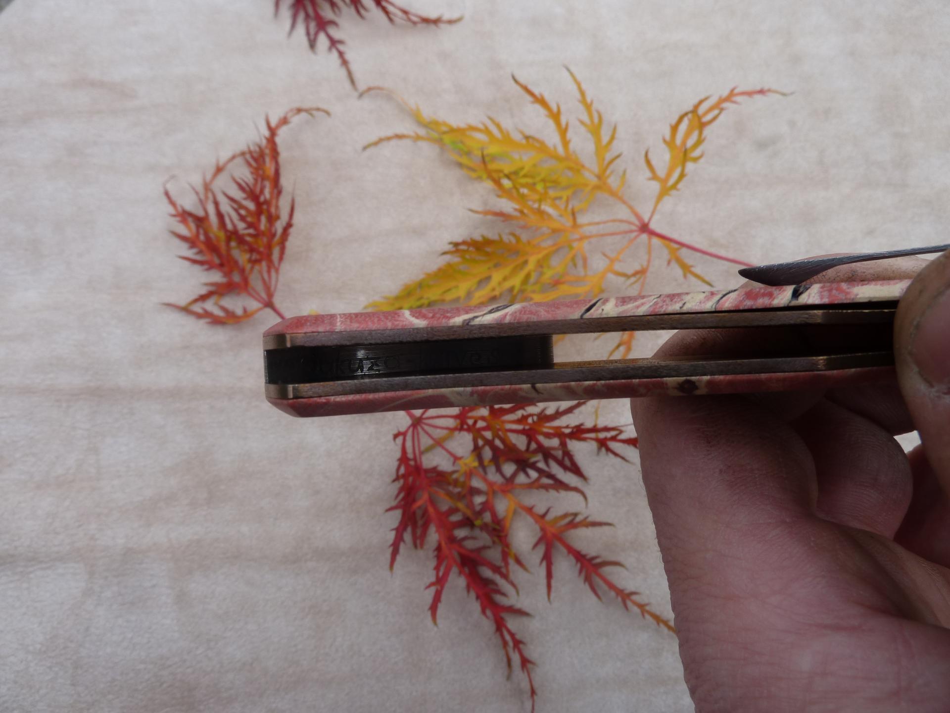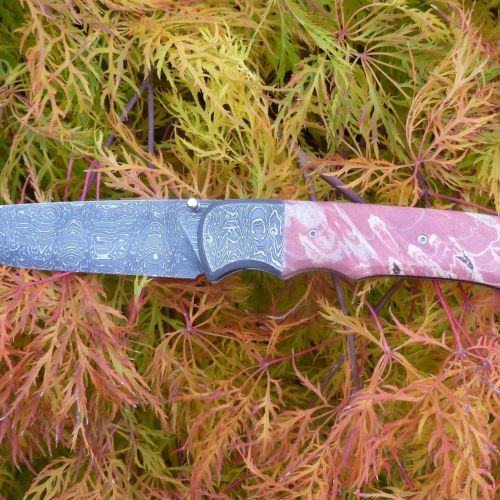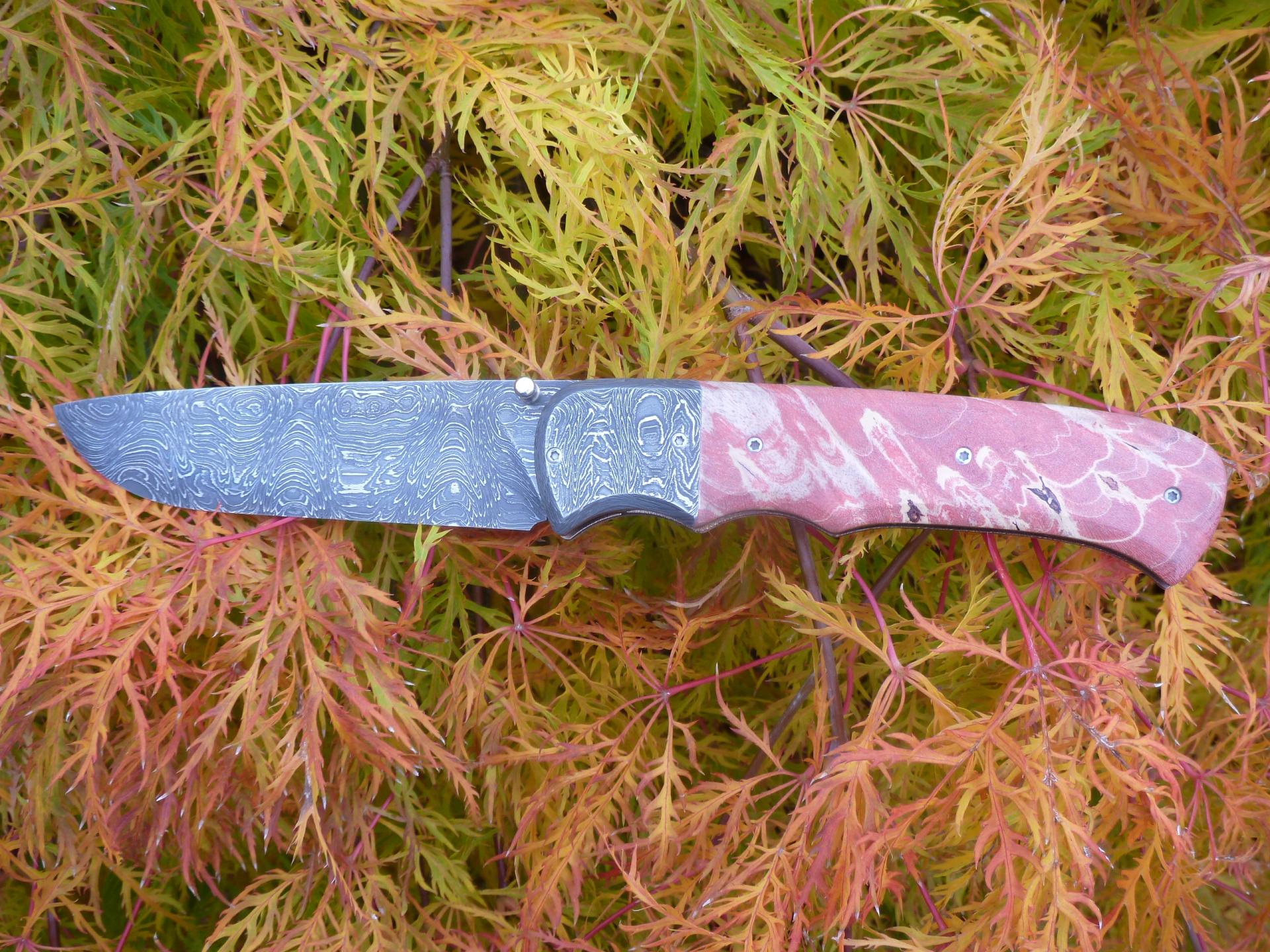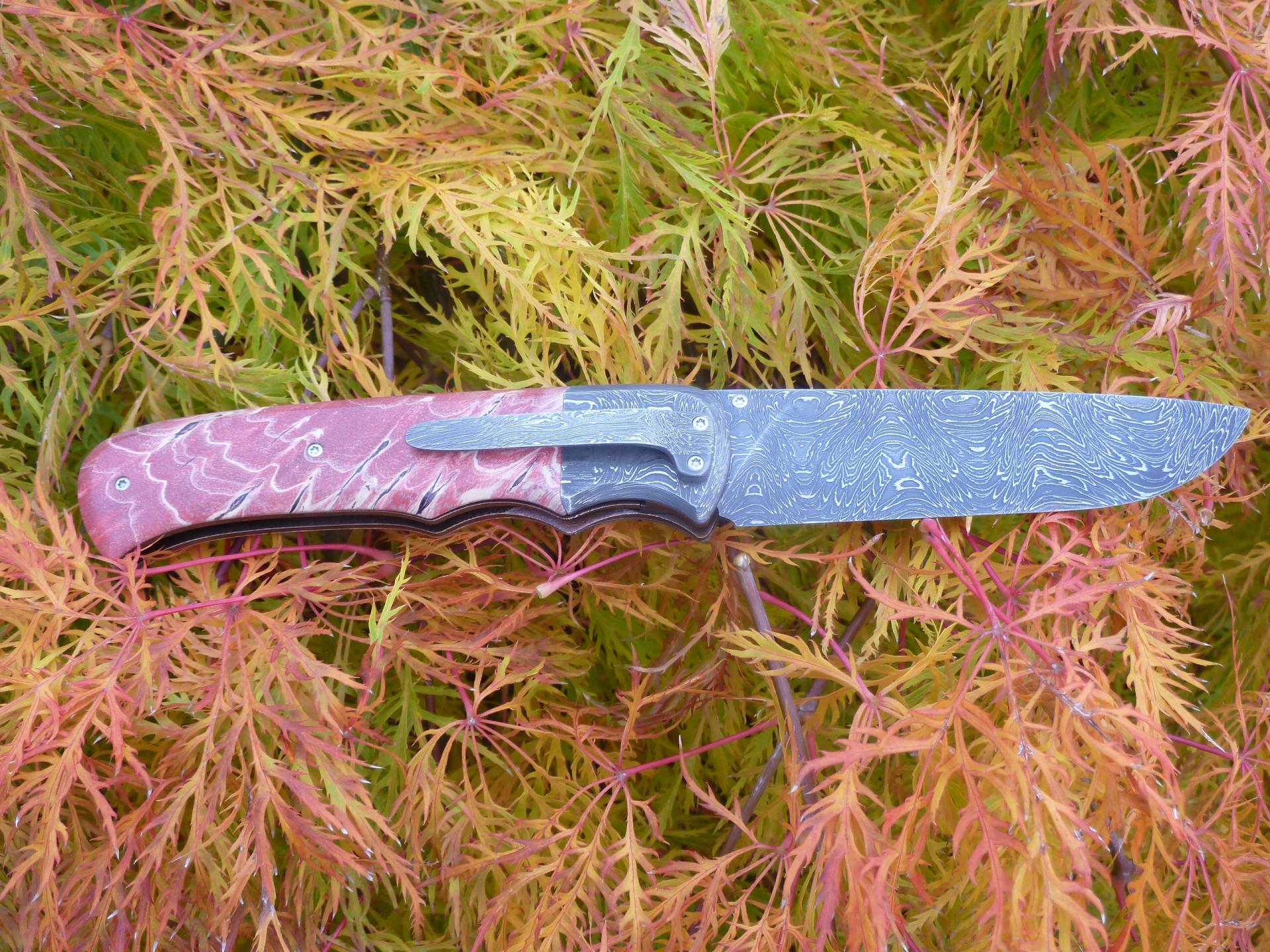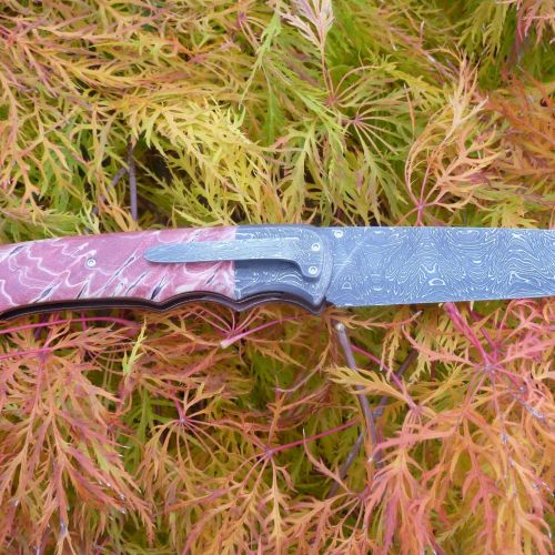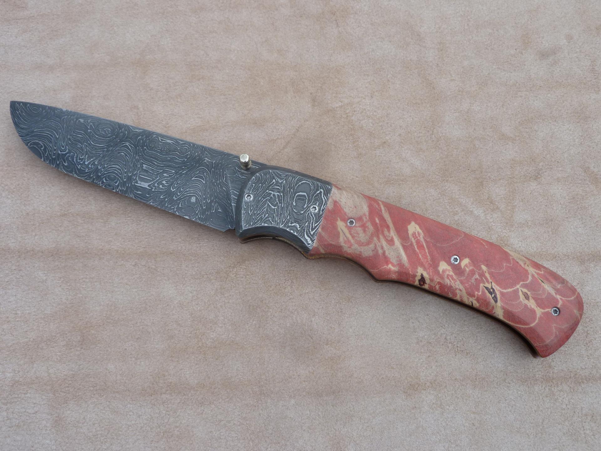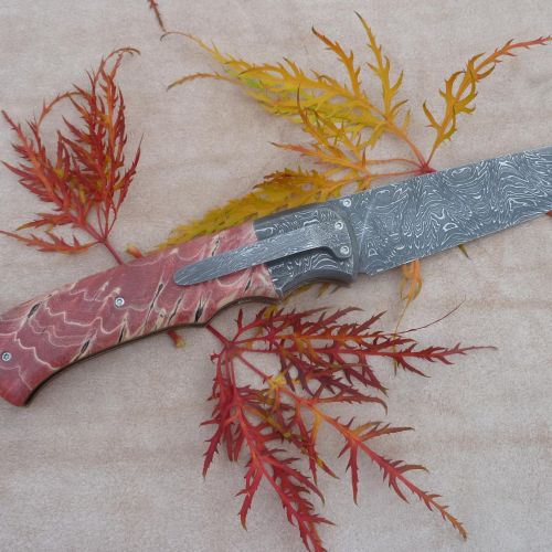 Čepel: damašek 95x3mm, bolstry i klip rovněž z damašku Rukojeť: příložky na rukojeti jsou ze stabilizovaného javoru Pouzdro: