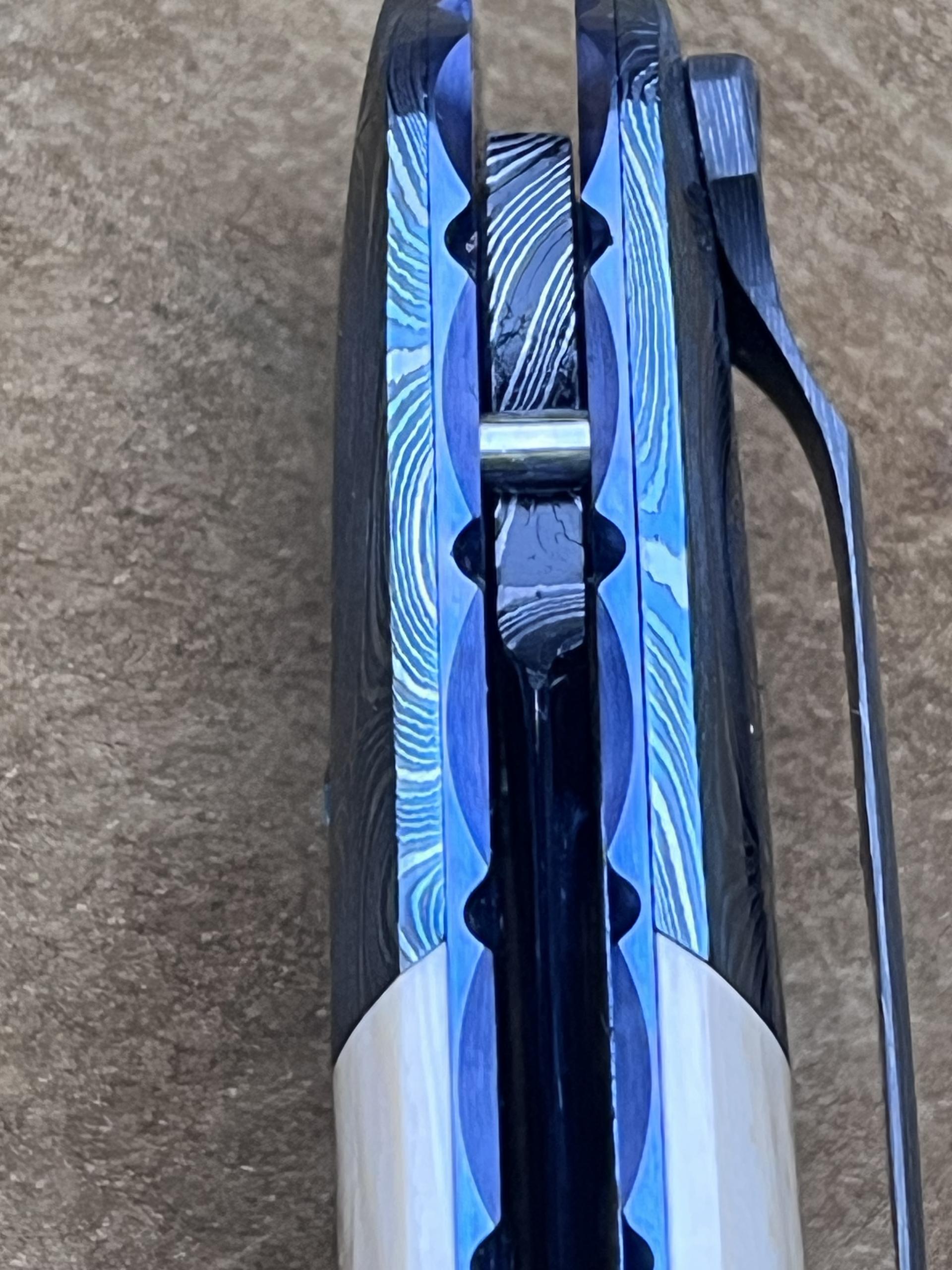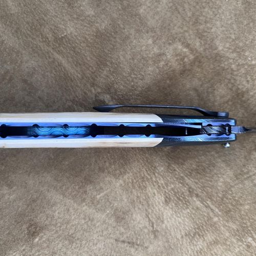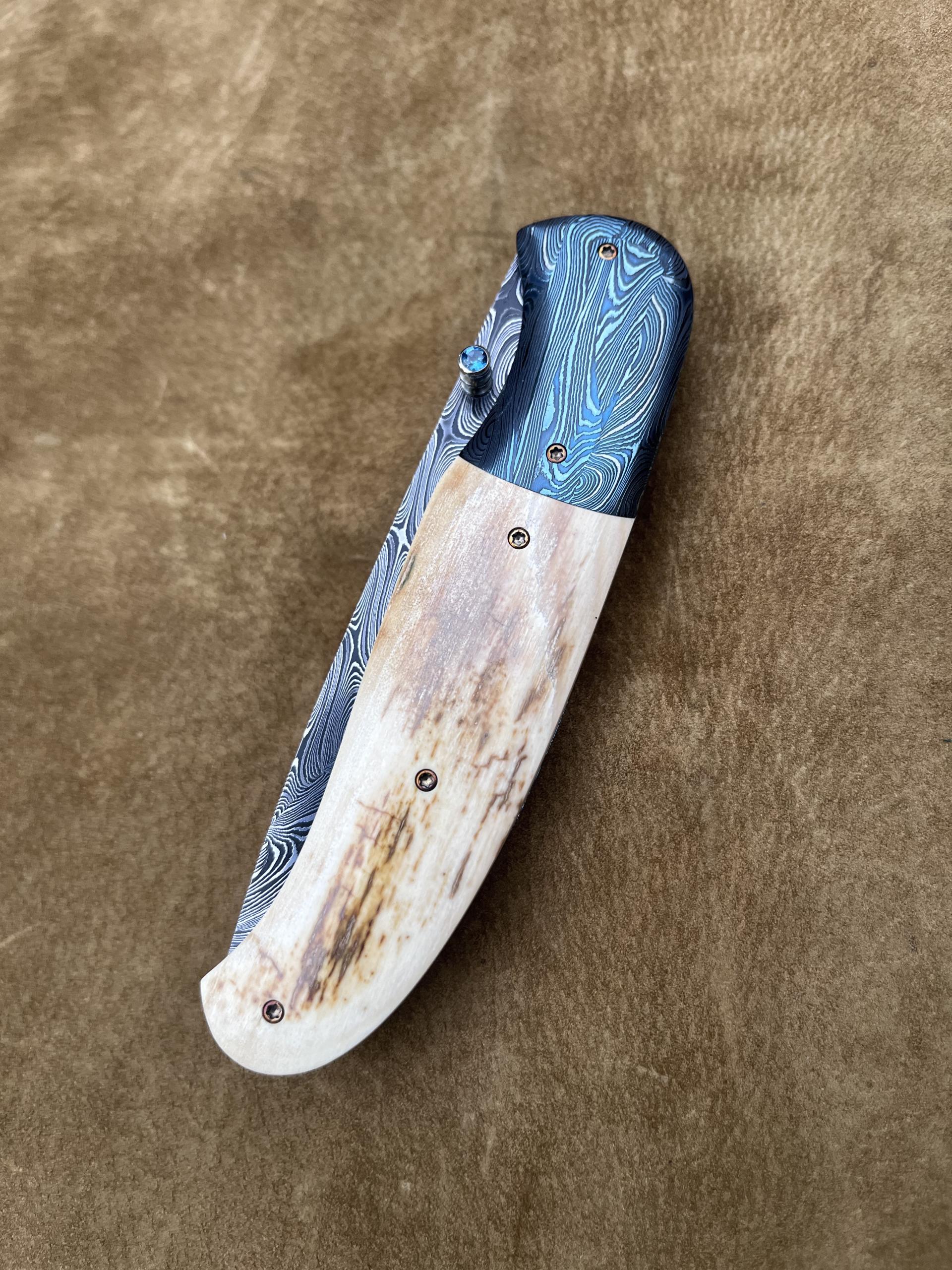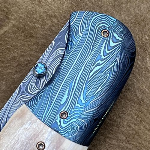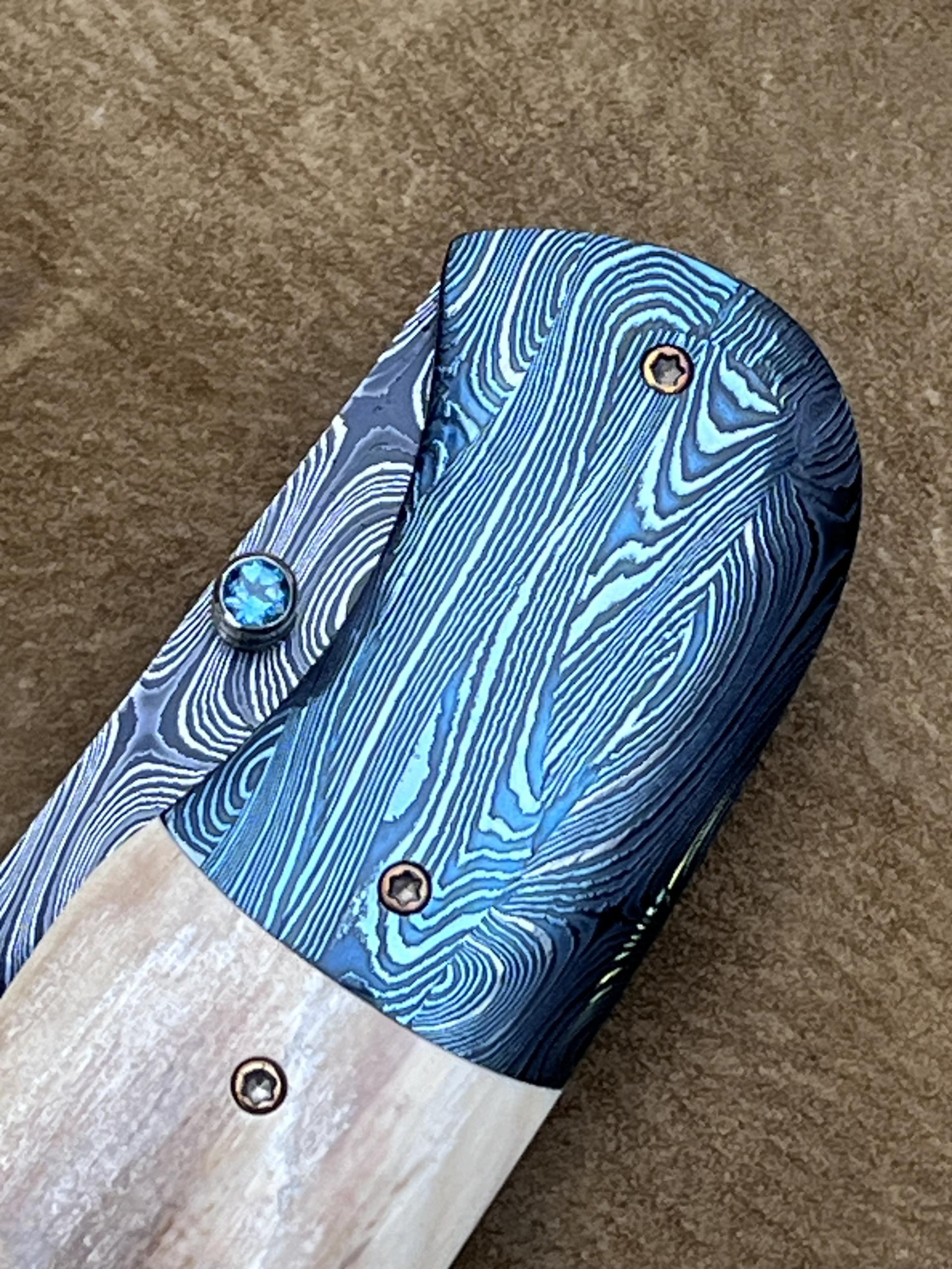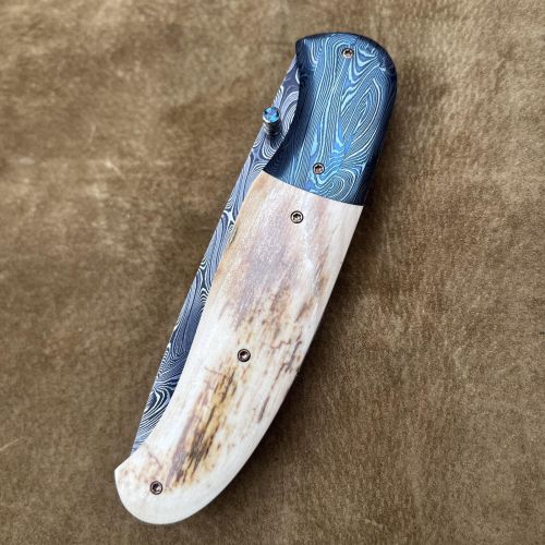 Čepel: uhlíkový torzní damašek tři pruty , pojistka linearlock titan GR Rukojeť: bolstry uhlíkový damašek , mamutí kel , otvírací kolíček Blue Topaz Pouzdro: kazeta z bahenního dubu