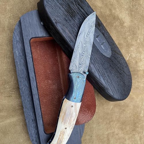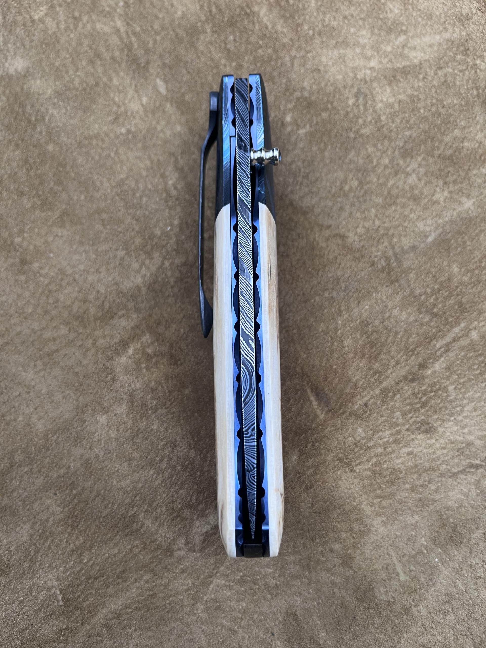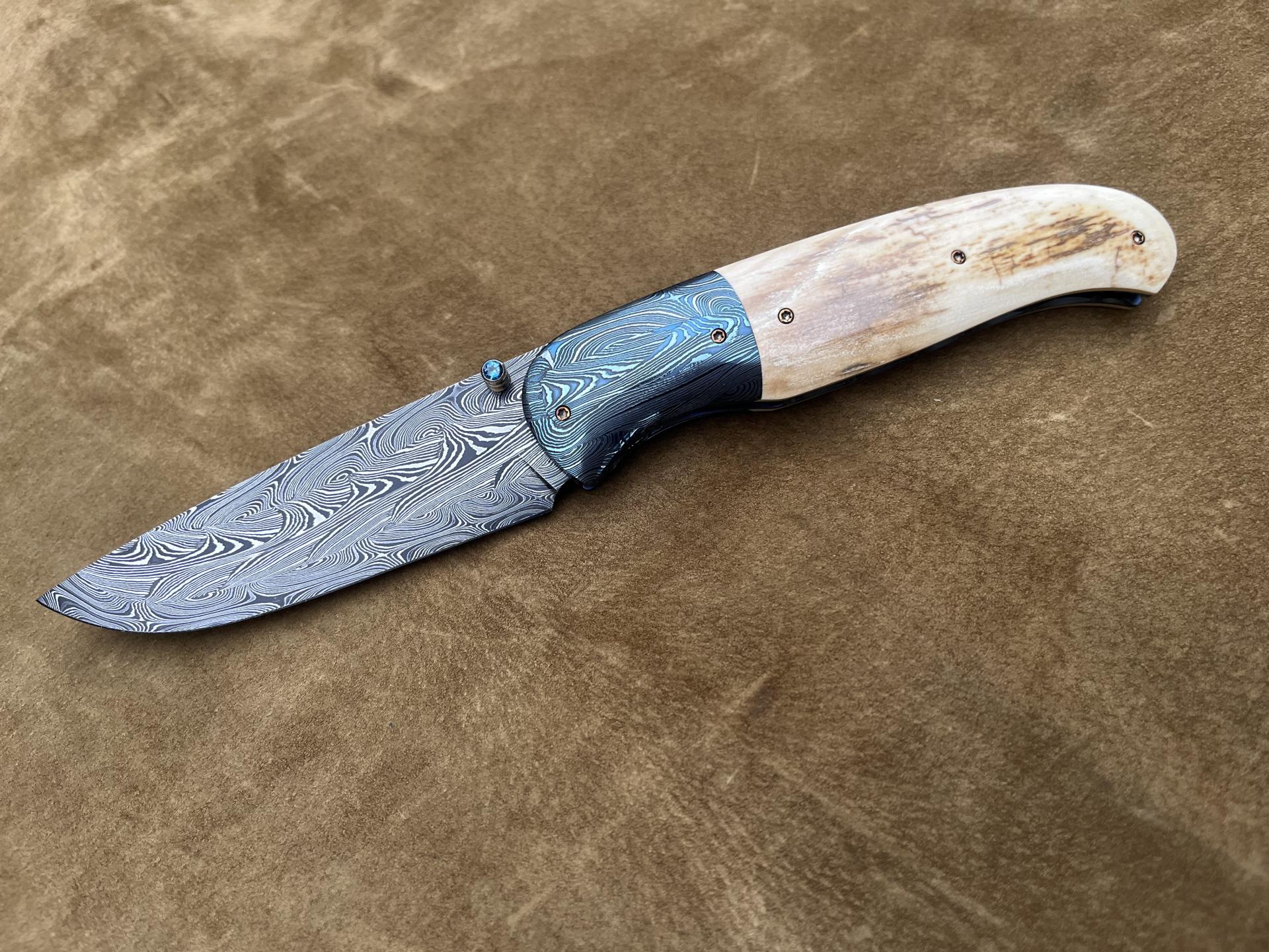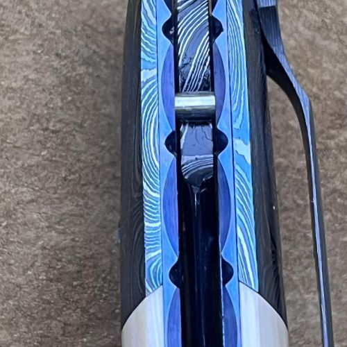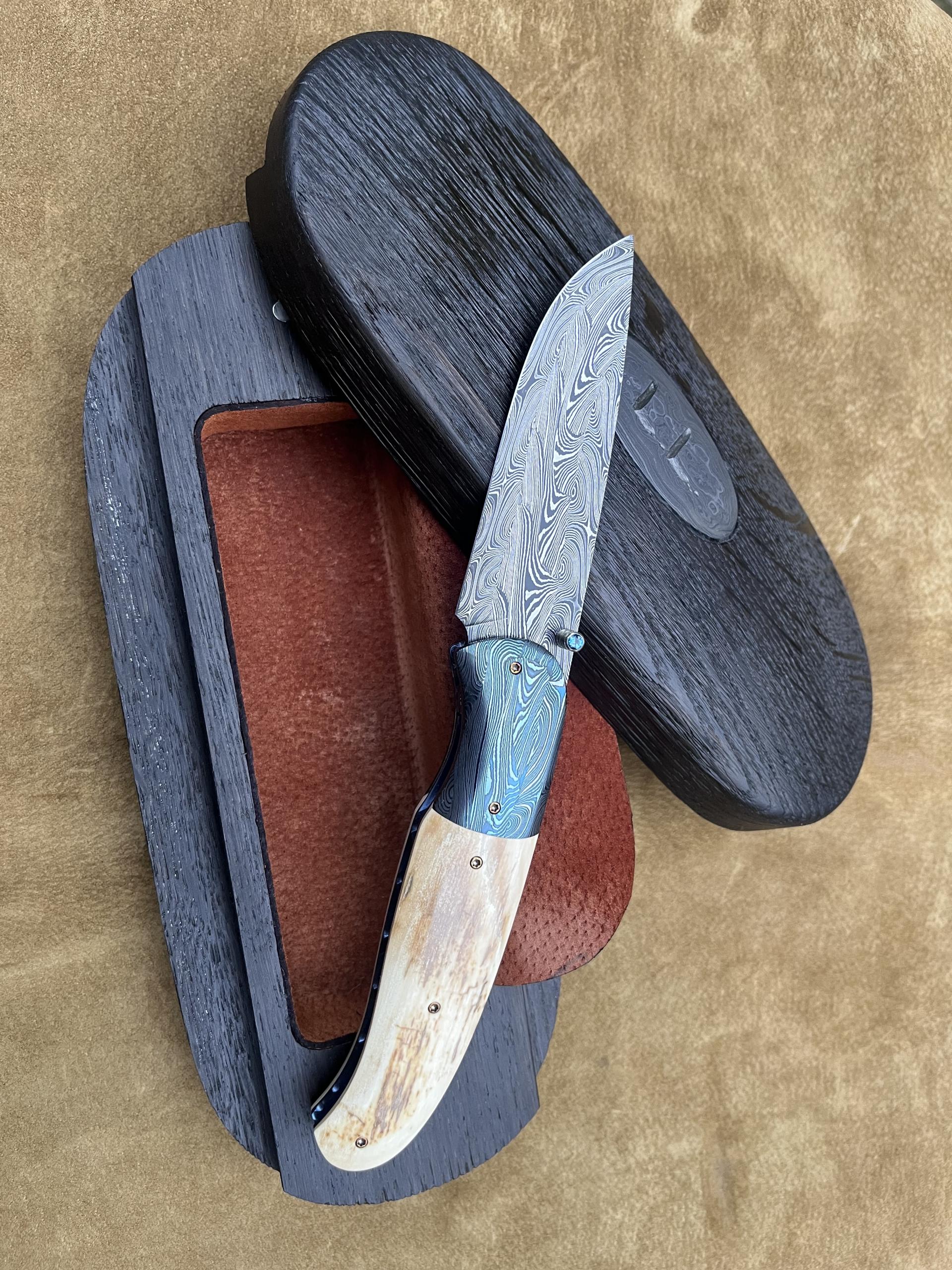 Čepel: uhlíkový torzní damašek tři pruty , pojistka linearlock titan GR Rukojeť: bolstry uhlíkový damašek , mamutí kel , otvírací kolíček Blue Topaz Pouzdro: kazeta z bahenního dubu