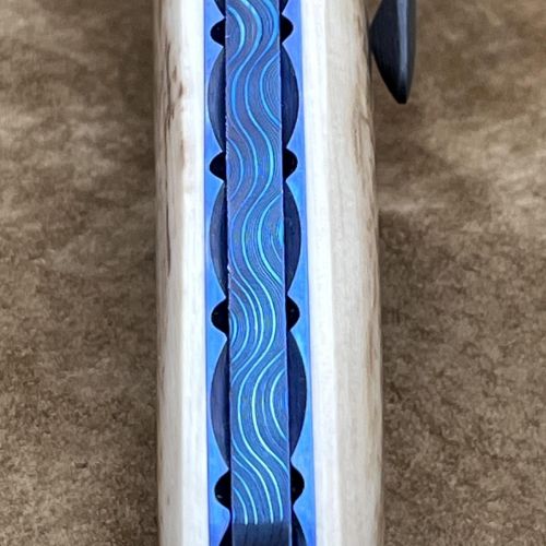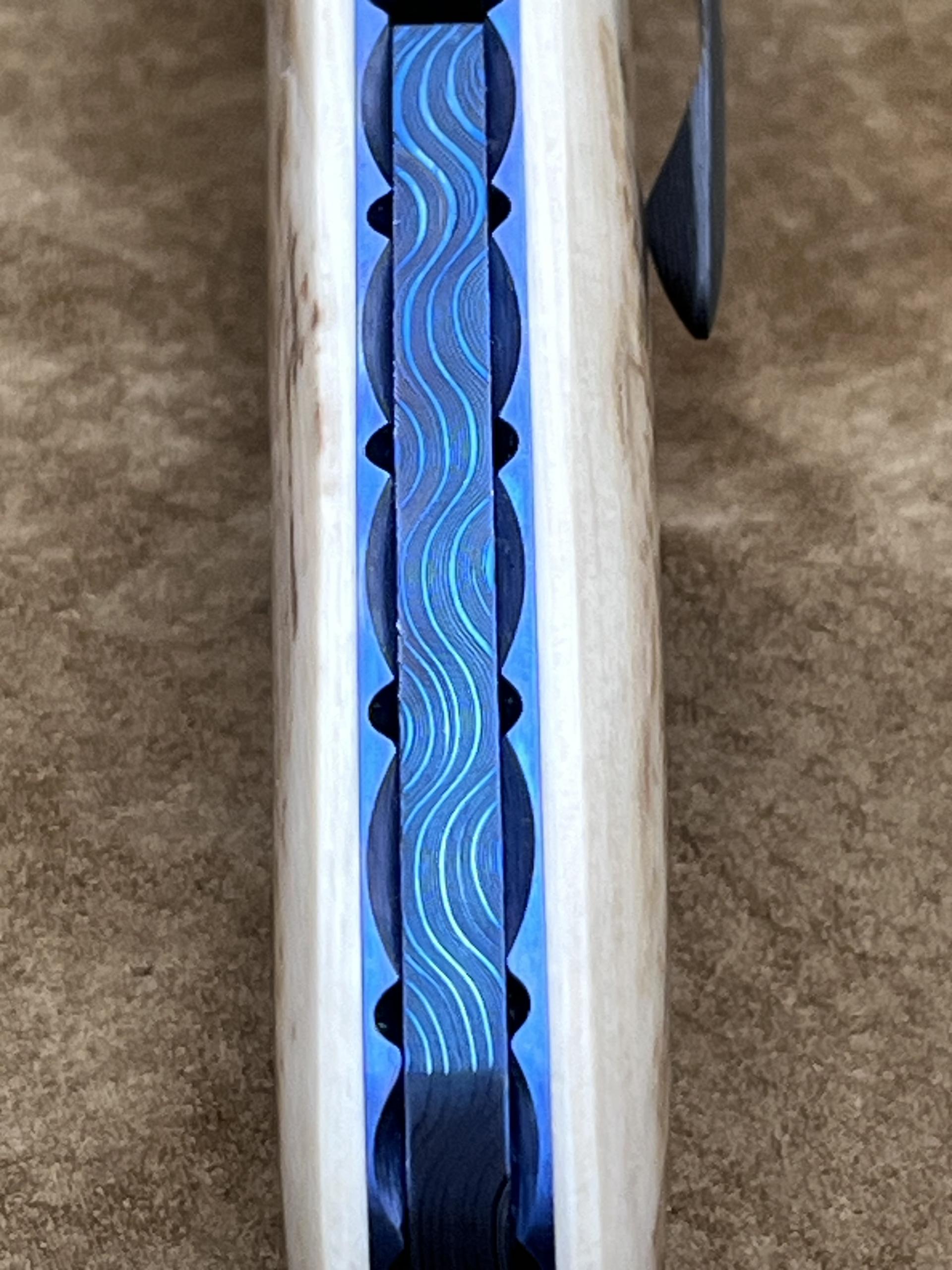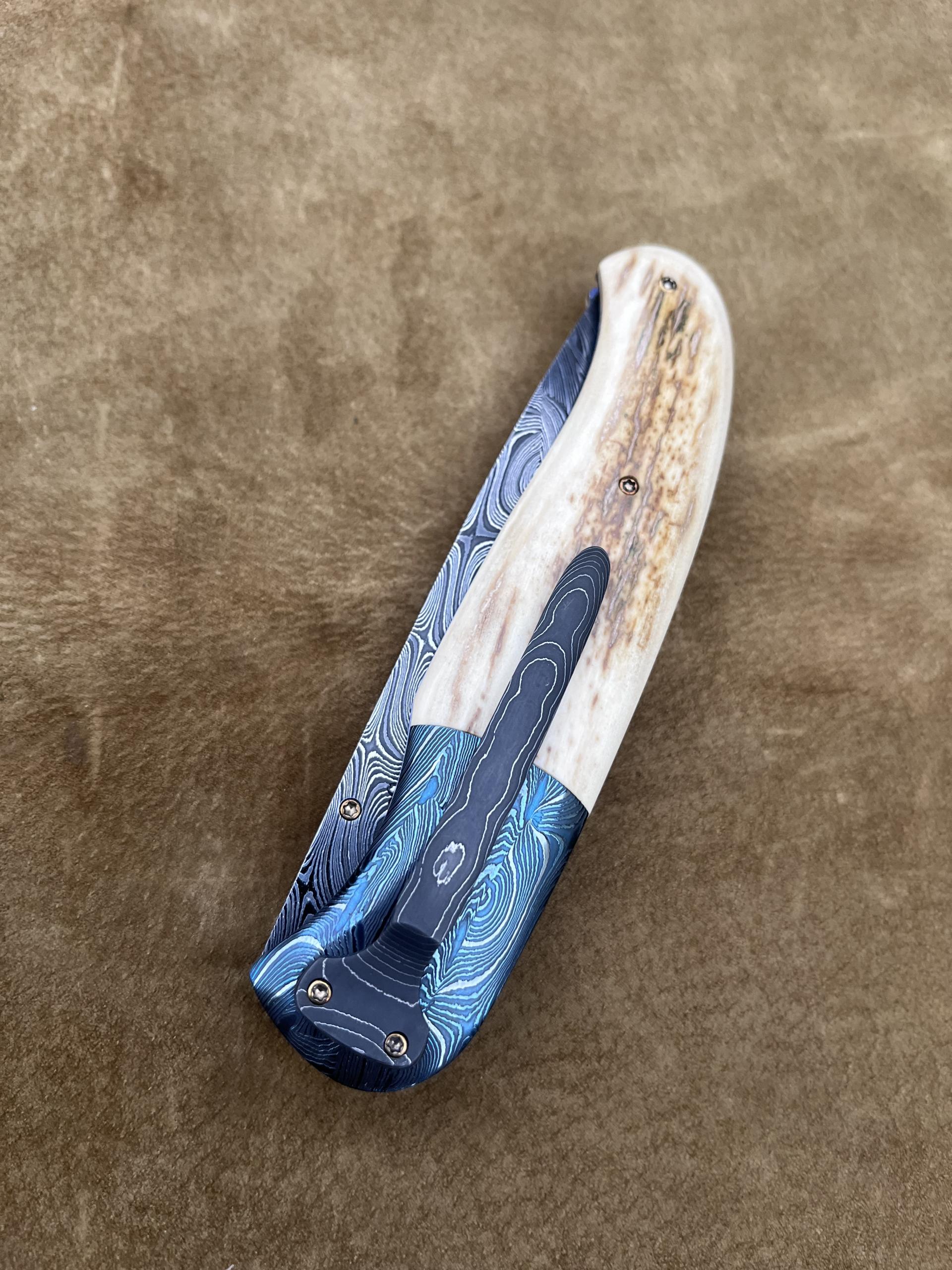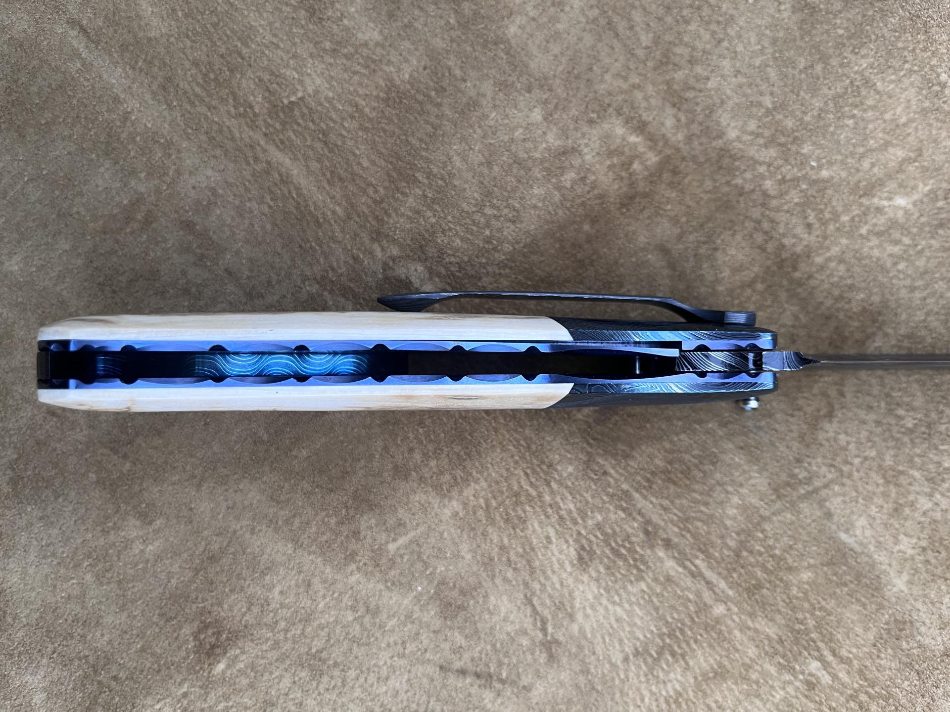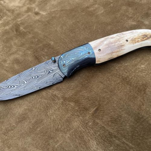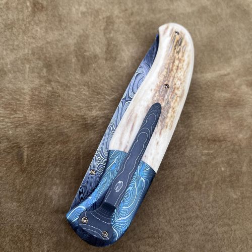 Čepel: uhlíkový torzní damašek tři pruty , pojistka linearlock titan GR Rukojeť: bolstry uhlíkový damašek , mamutí kel , otvírací kolíček Blue Topaz Pouzdro: kazeta z bahenního dubu