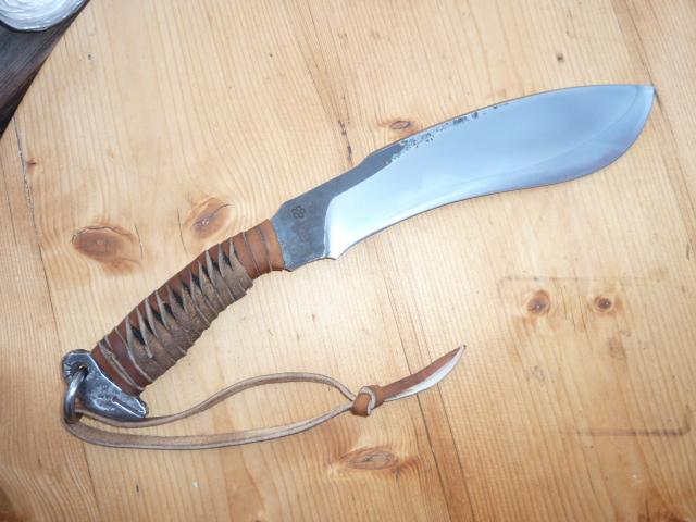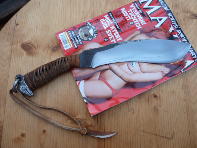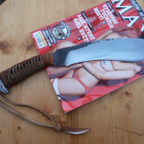 čepel vykována z vinuté pružiny z lokomotivy, parciálně kalená