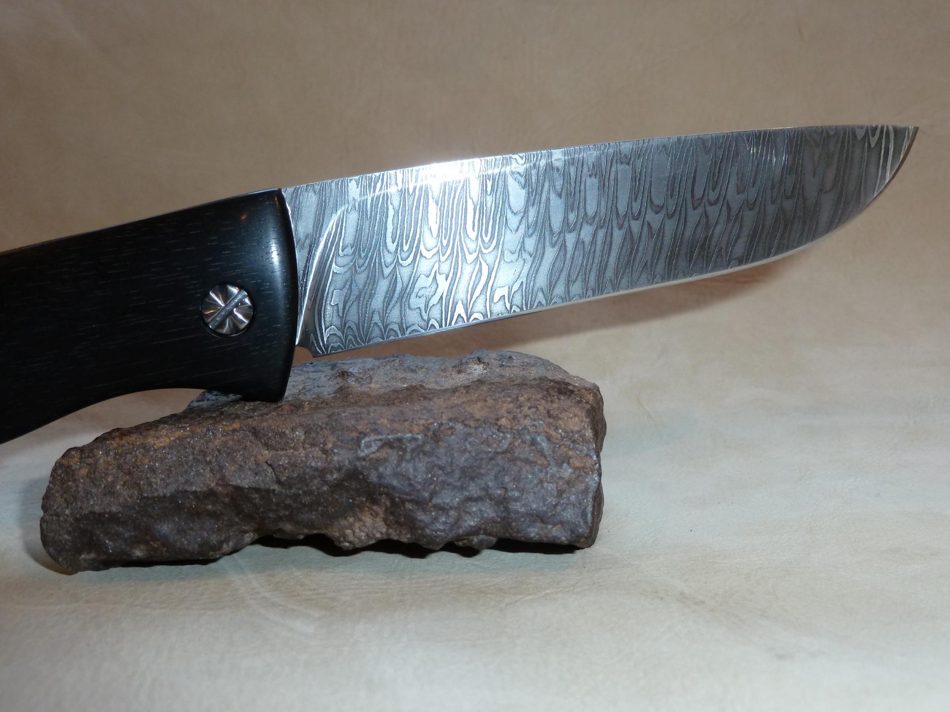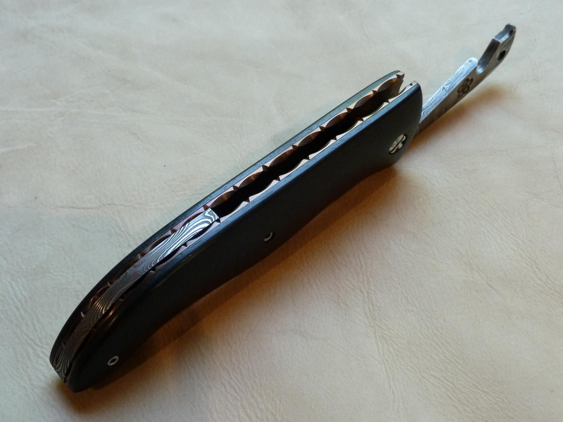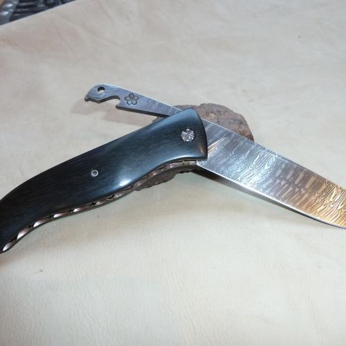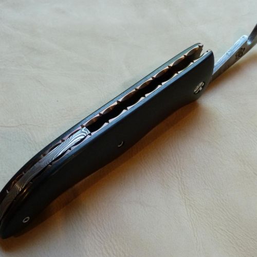 Rukojeť: příložky z anodizovaného zdobeného titanu, dřevo - eben