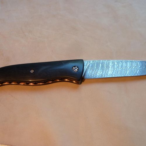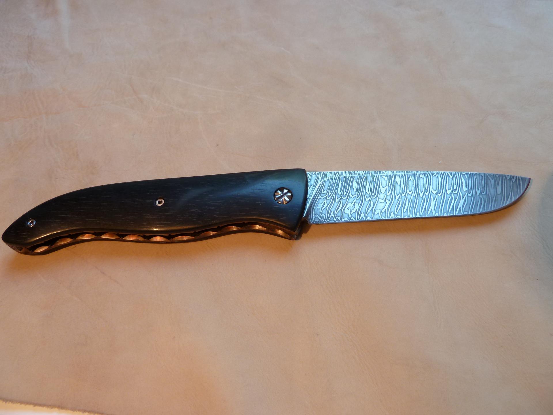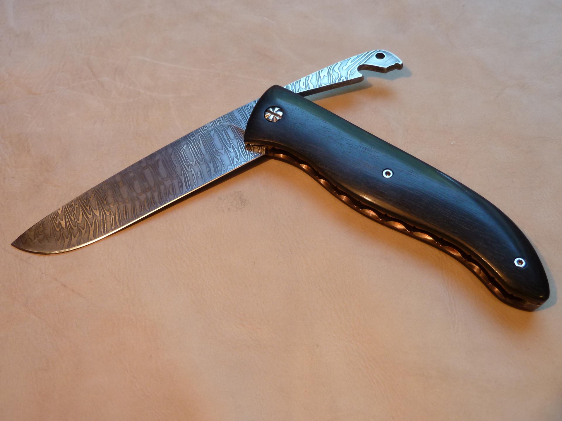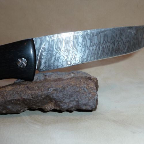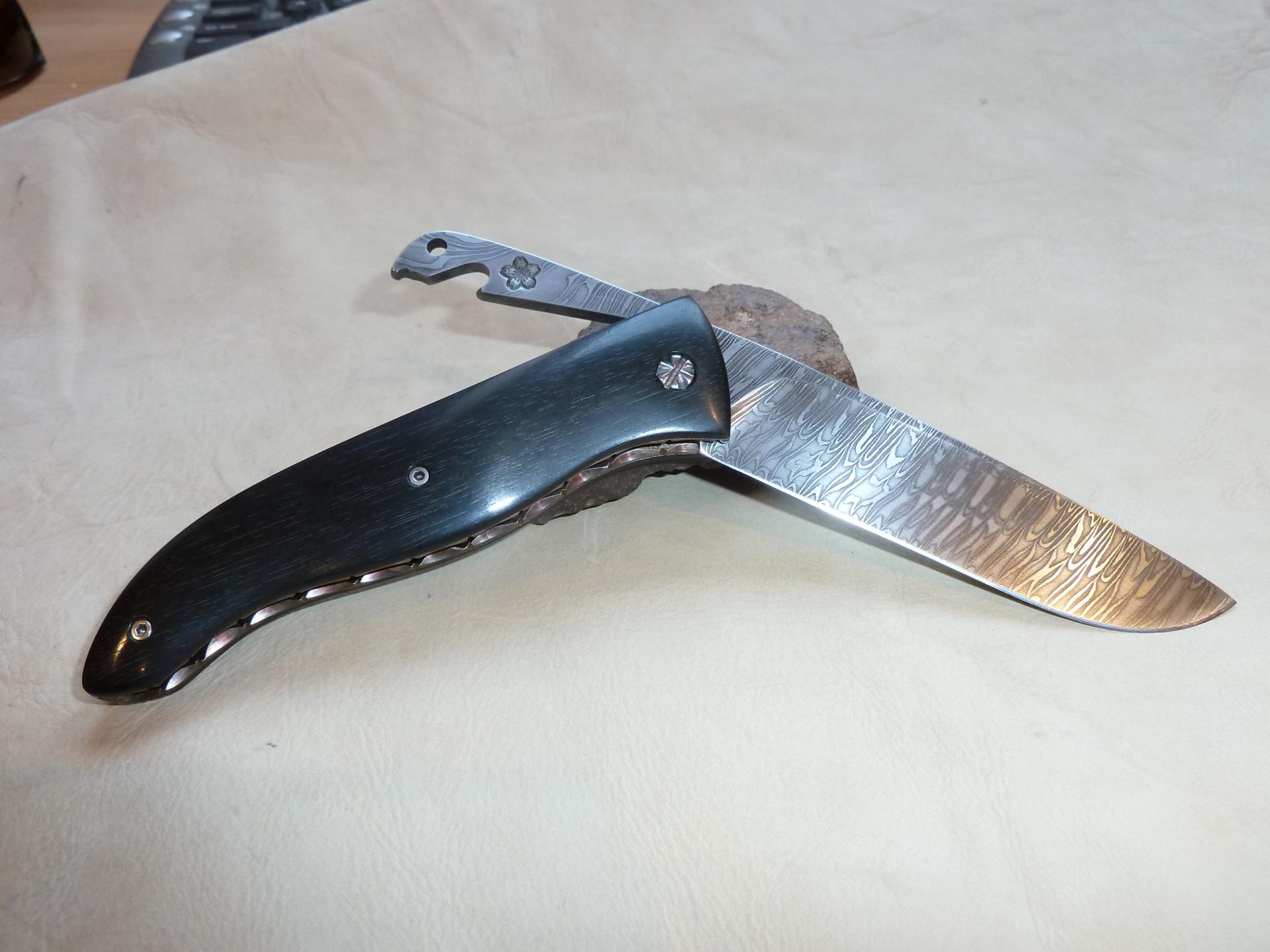 Rukojeť: příložky z anodizovaného zdobeného titanu, dřevo - eben