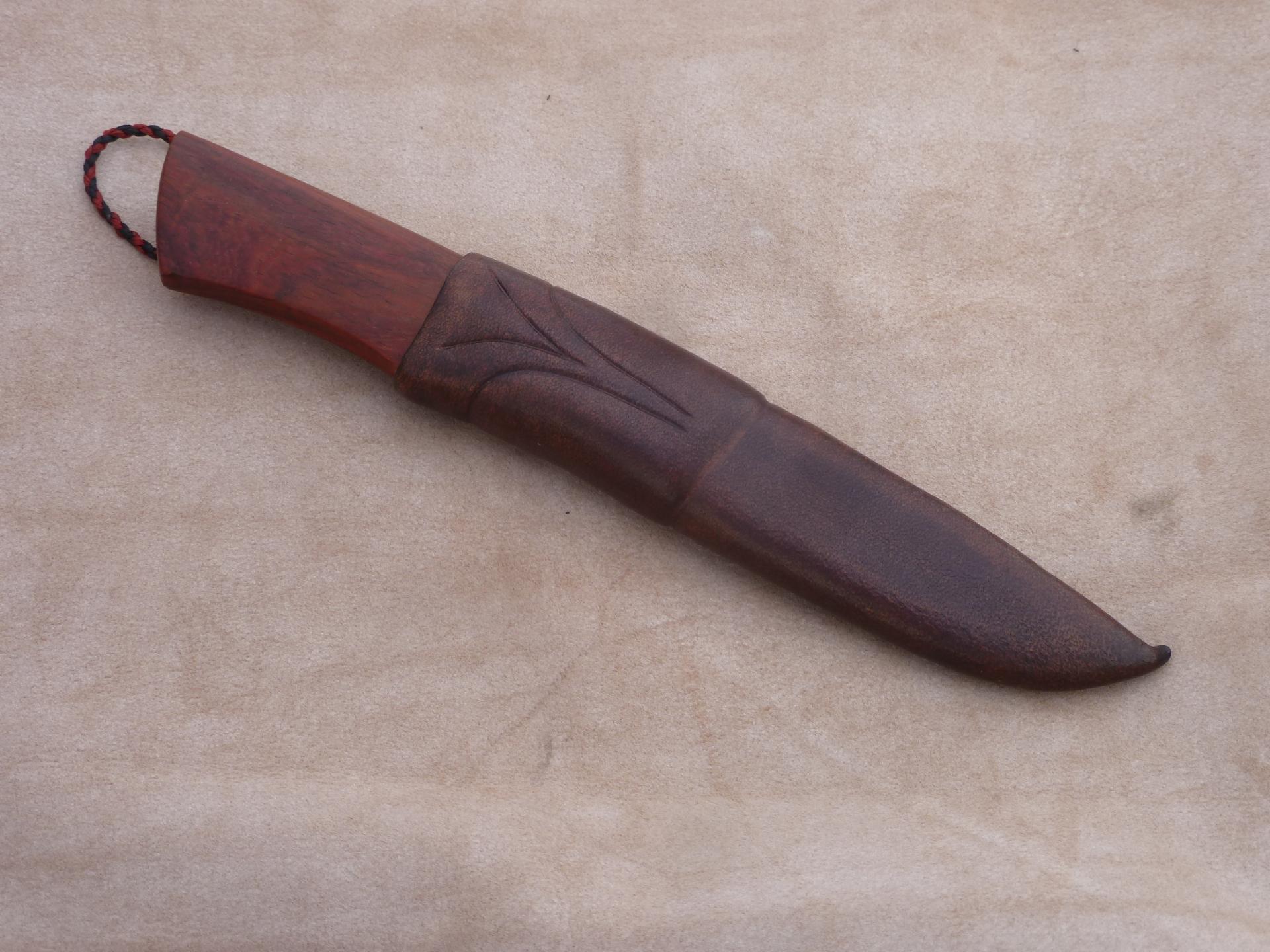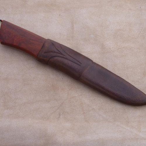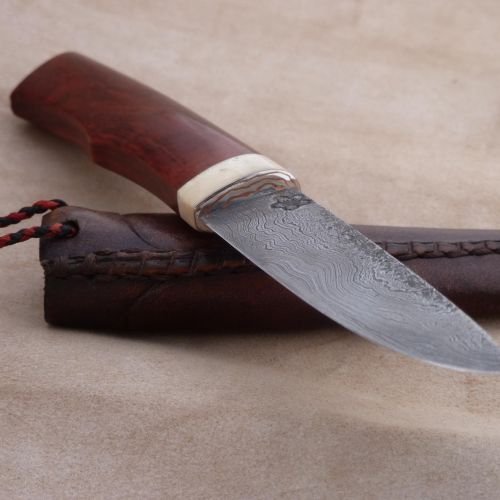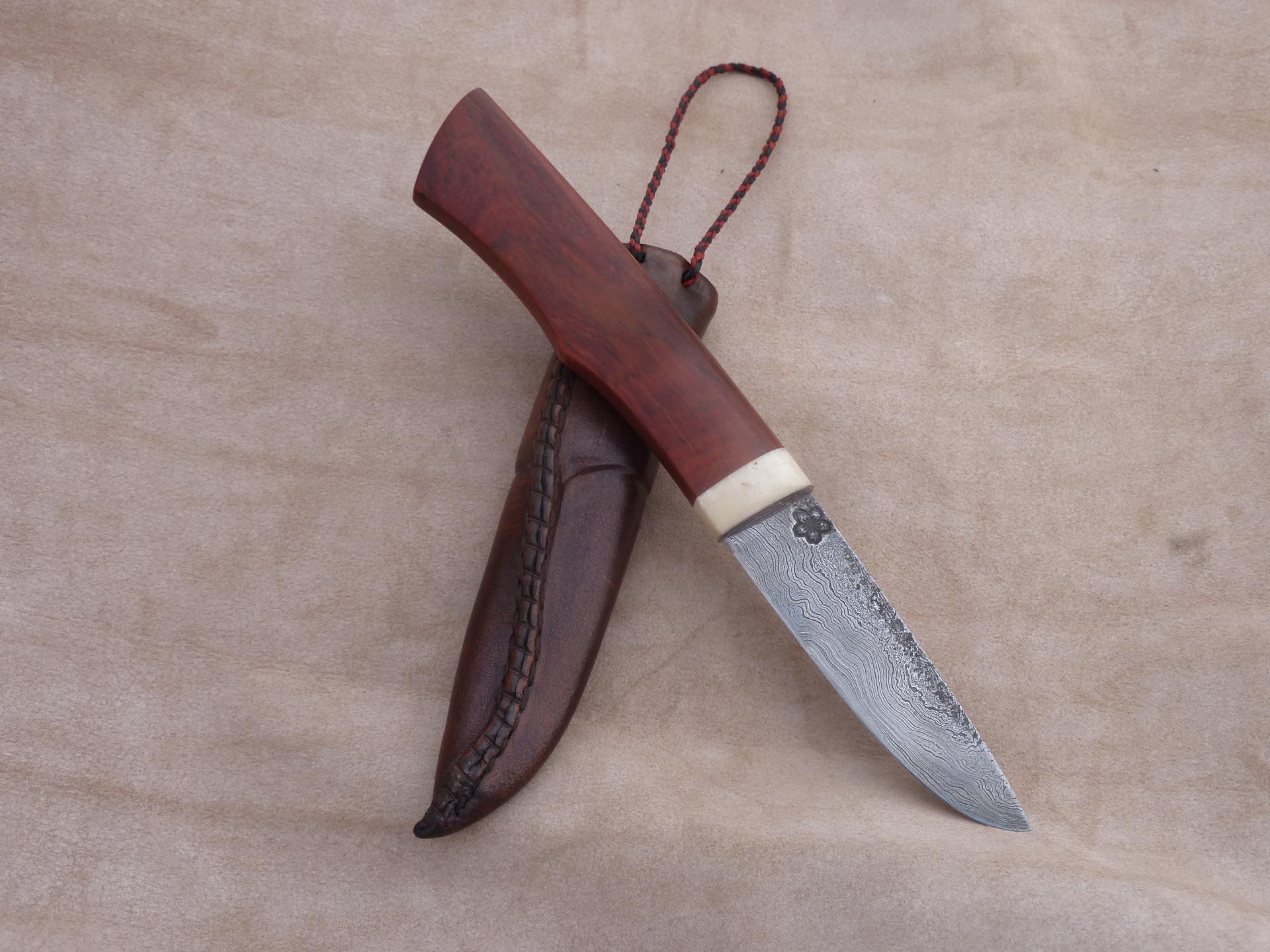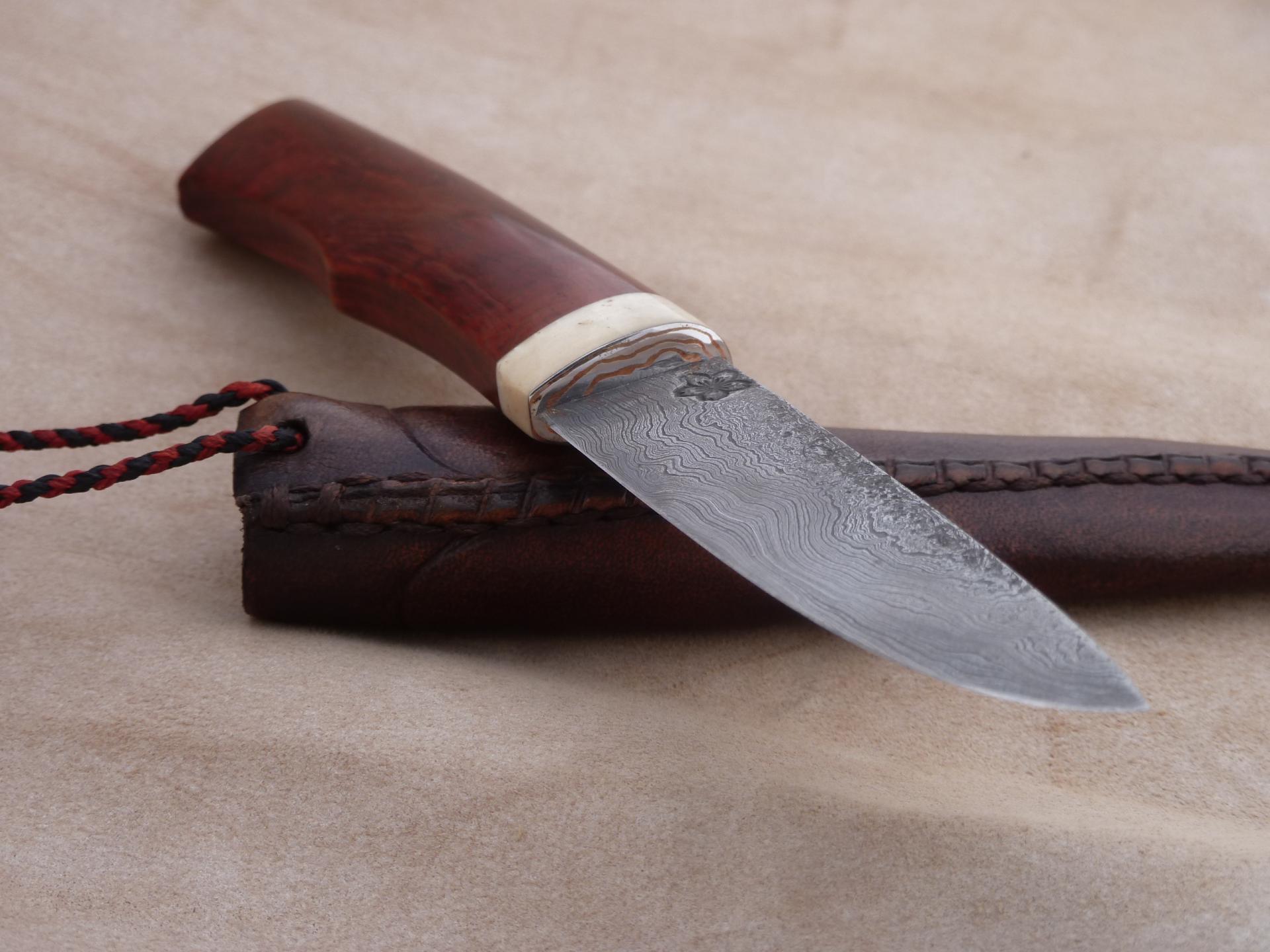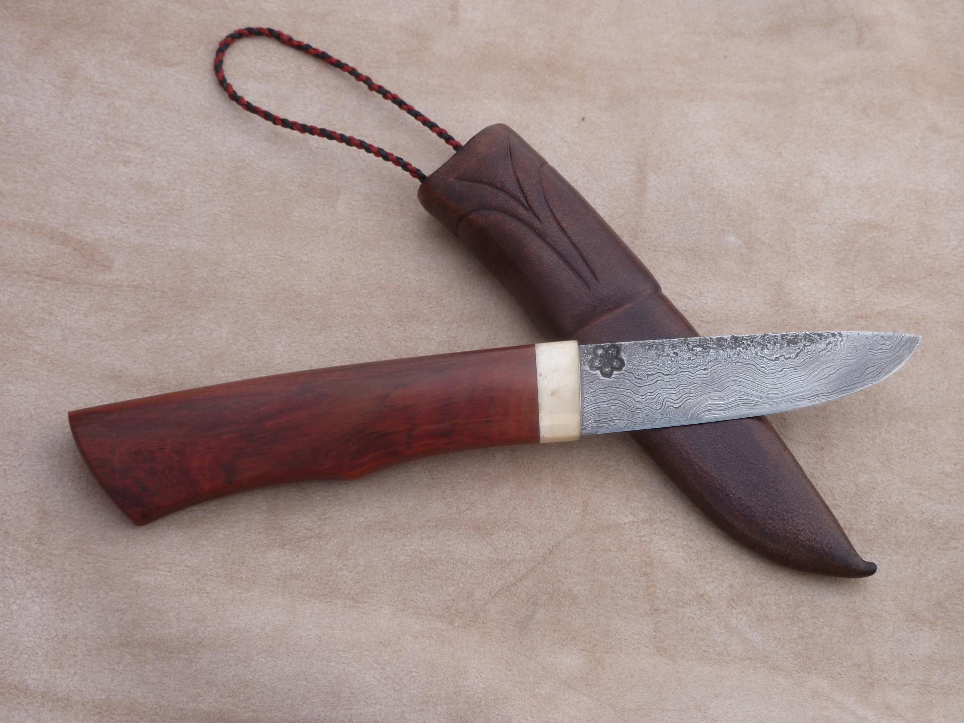 Čepel: damašek jemná kresba na diviko Rukojeť: záštita kousek mokume, hovězí kost, dřevo z Laosu místními nazívané Makaňo Pouzdro: hovězina