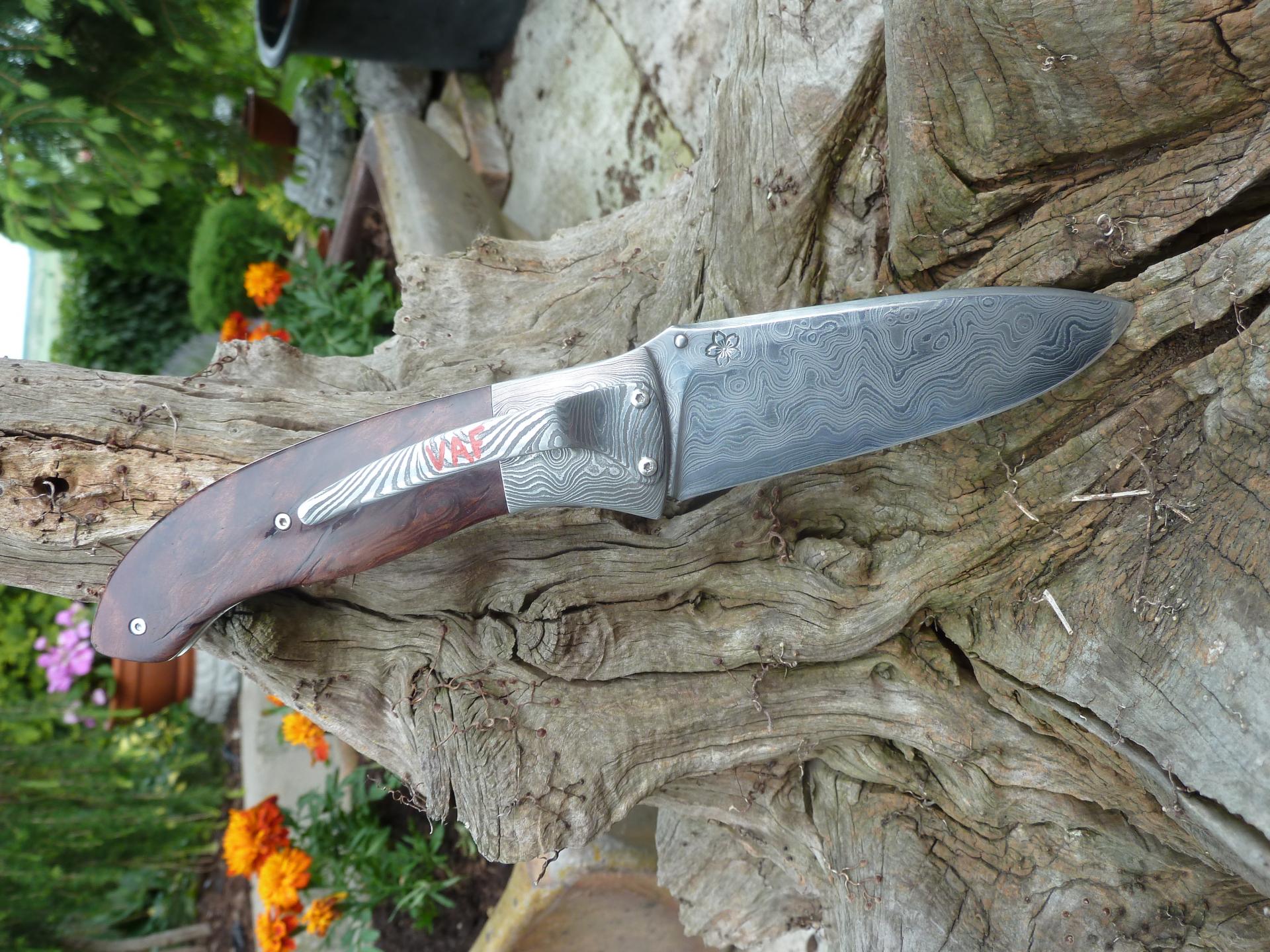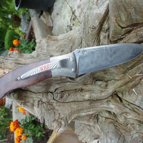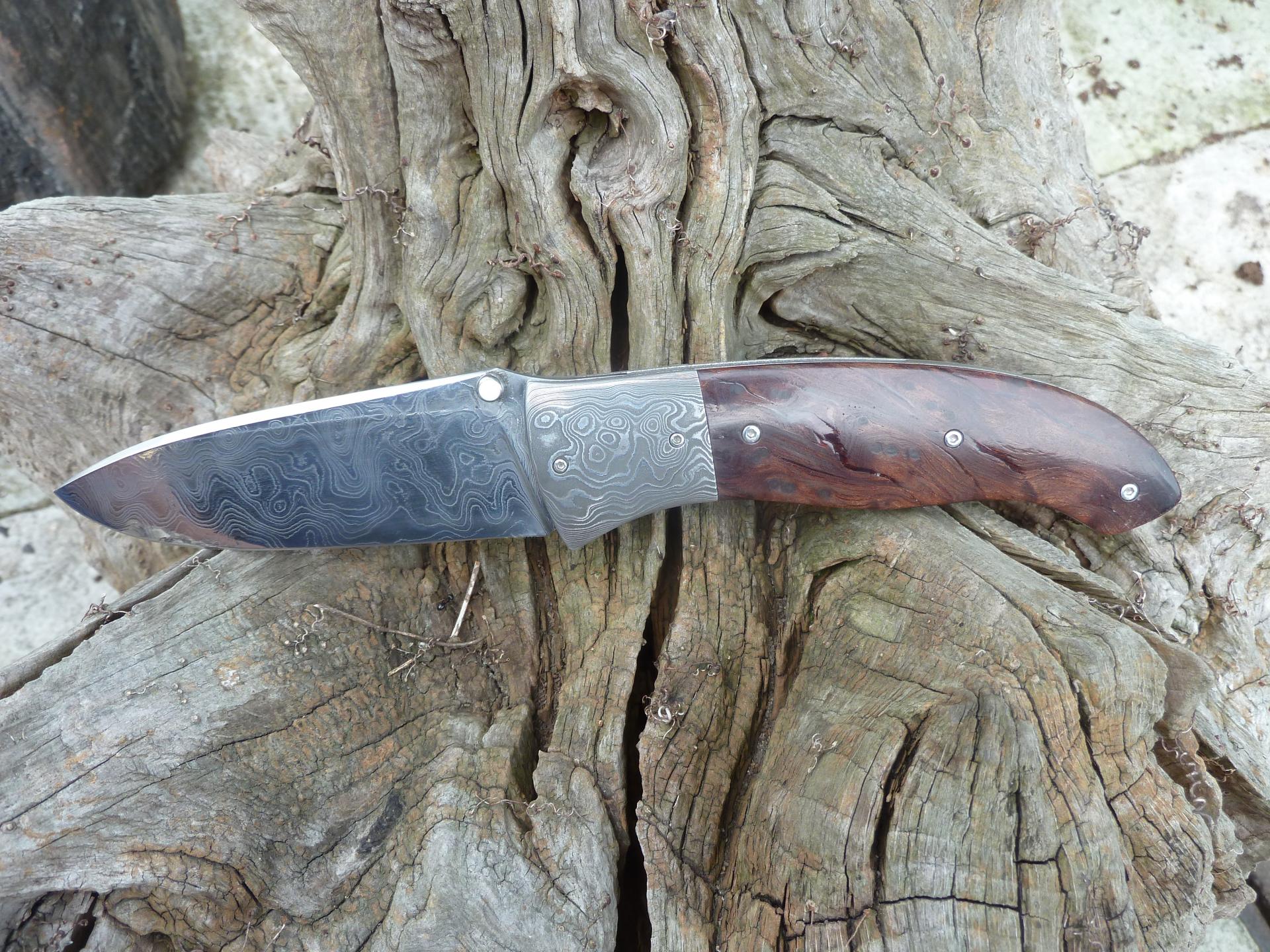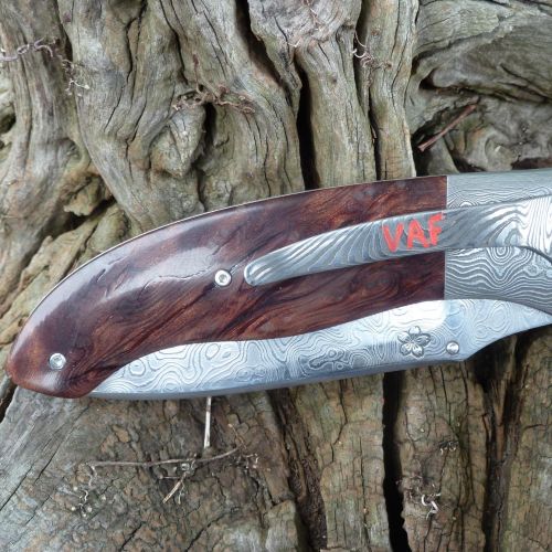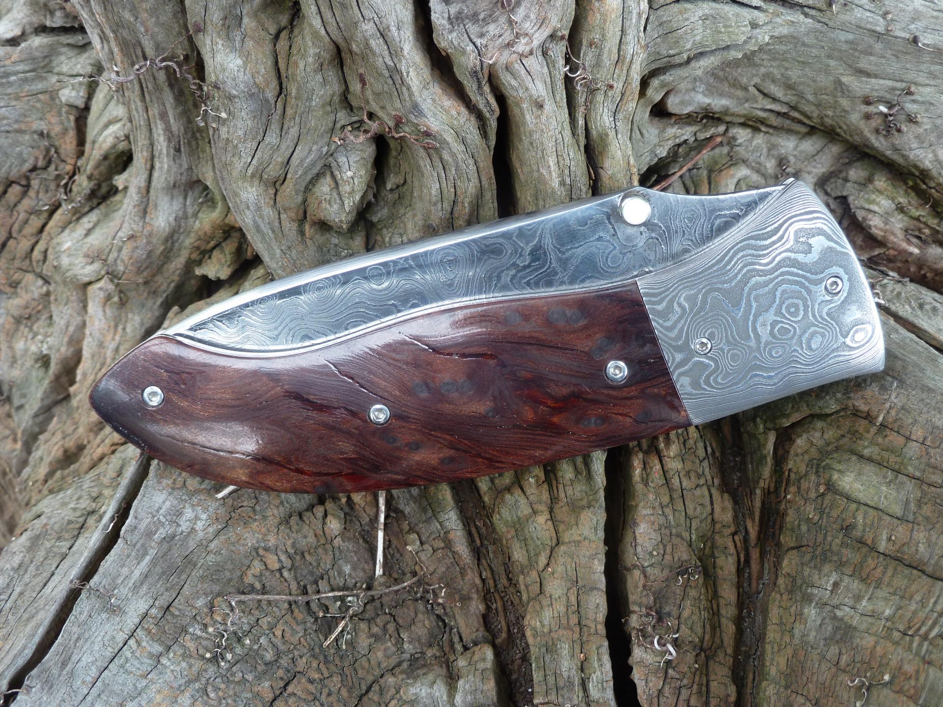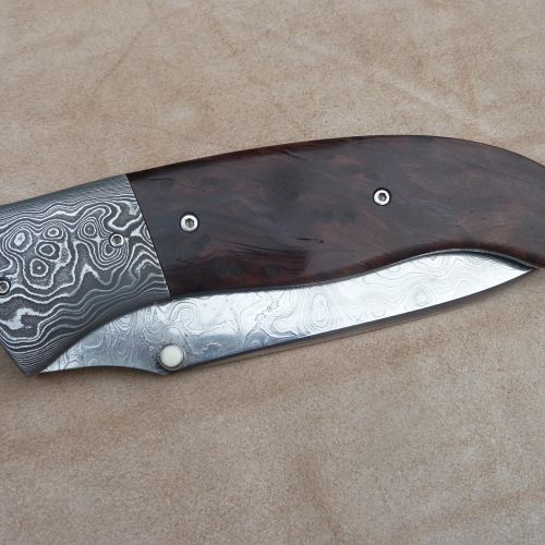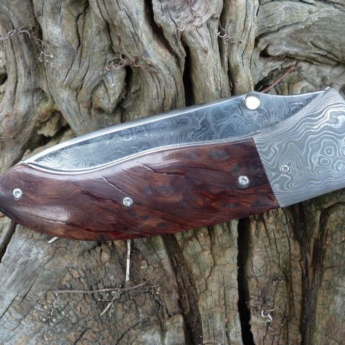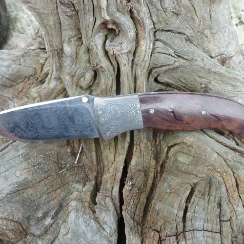 Čepel: divokej damašek cca 200 vrstev, bolstry a klip rovněž z damašku, dřevo Redwod, čepel 100mm Rukojeť: Pouzdro: