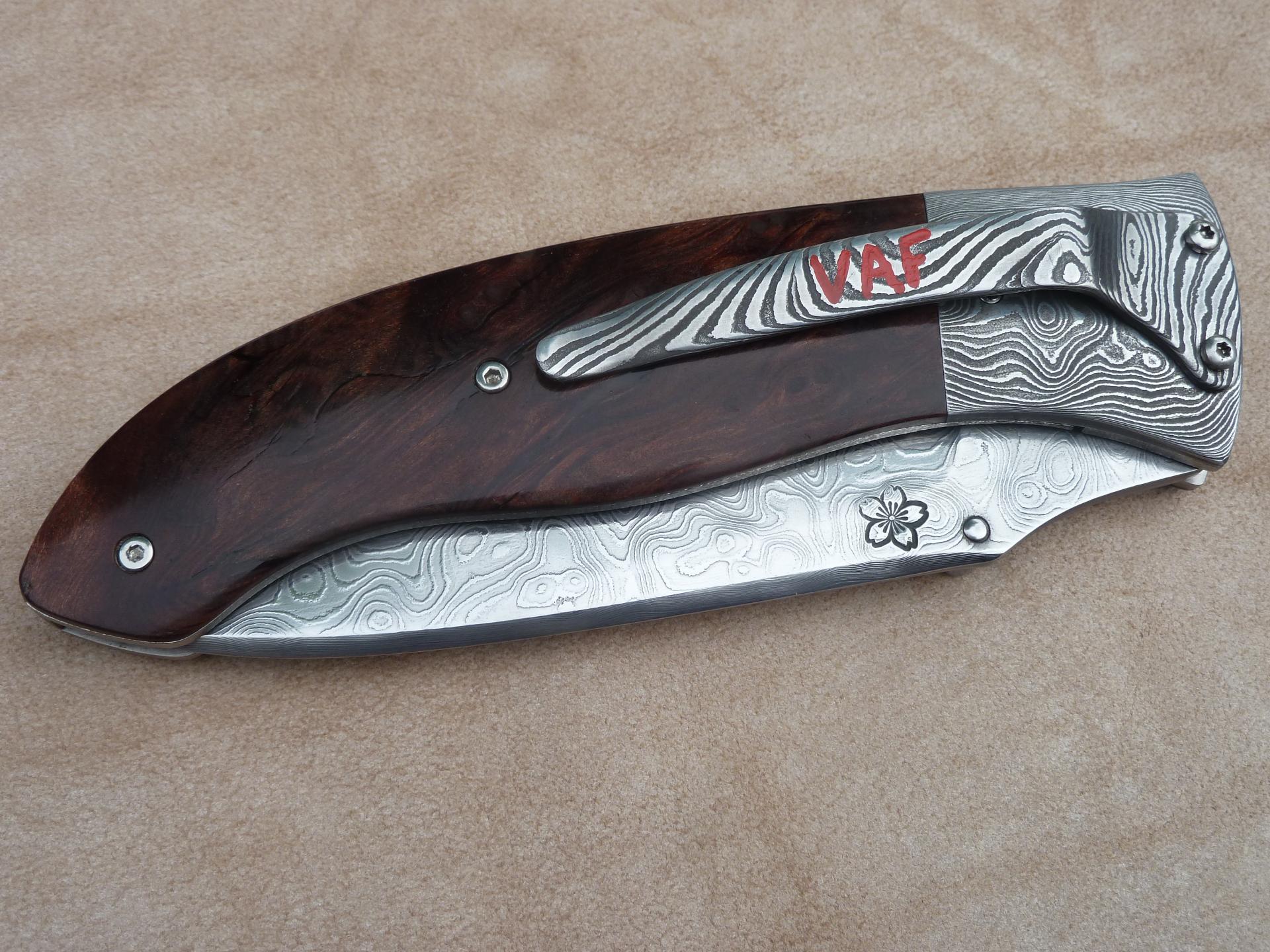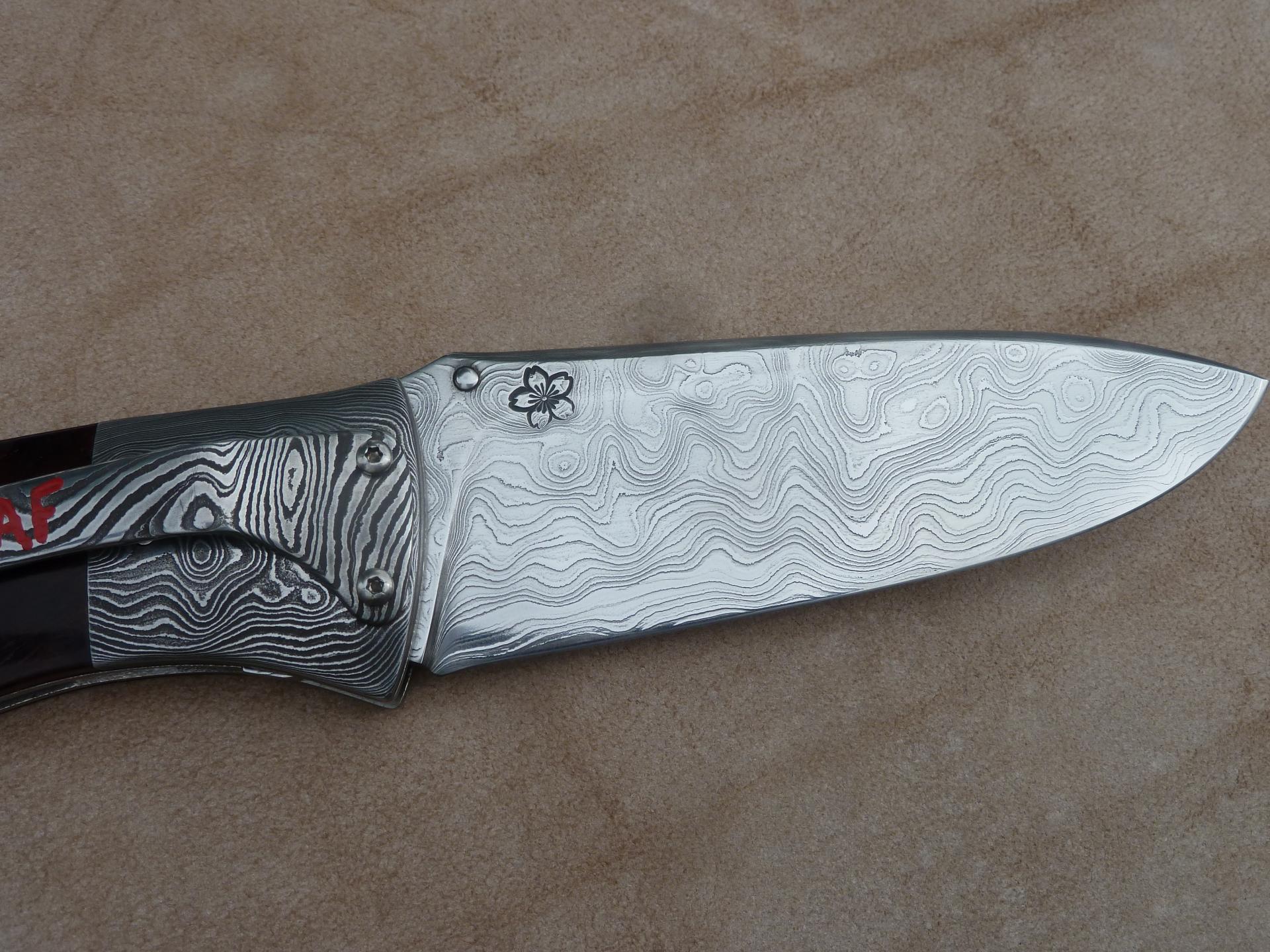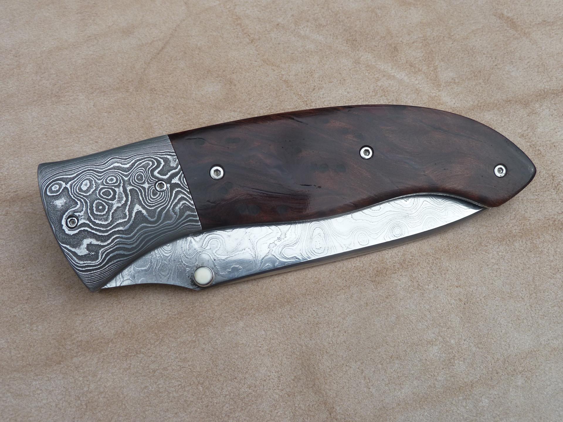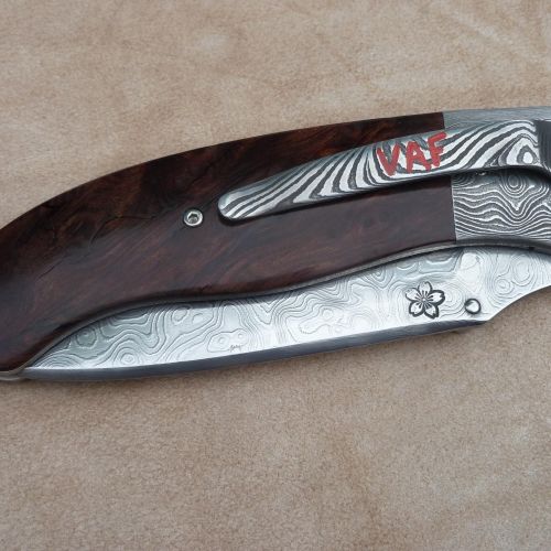 Čepel: divokej damašek cca 200 vrstev, bolstry a klip rovněž z damašku, dřevo Redwod, čepel 100mm Rukojeť: Pouzdro: