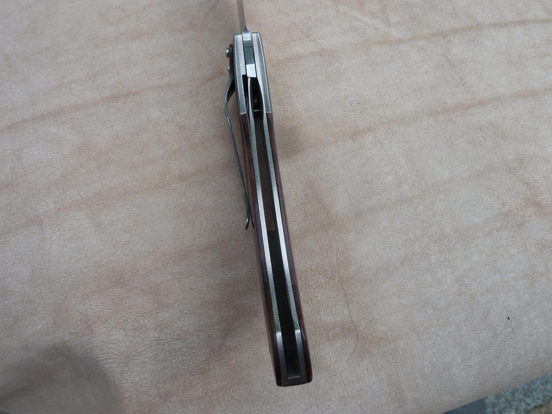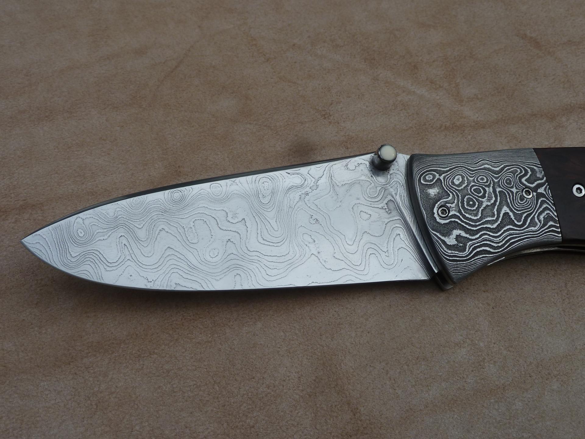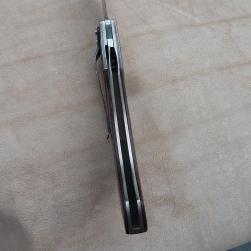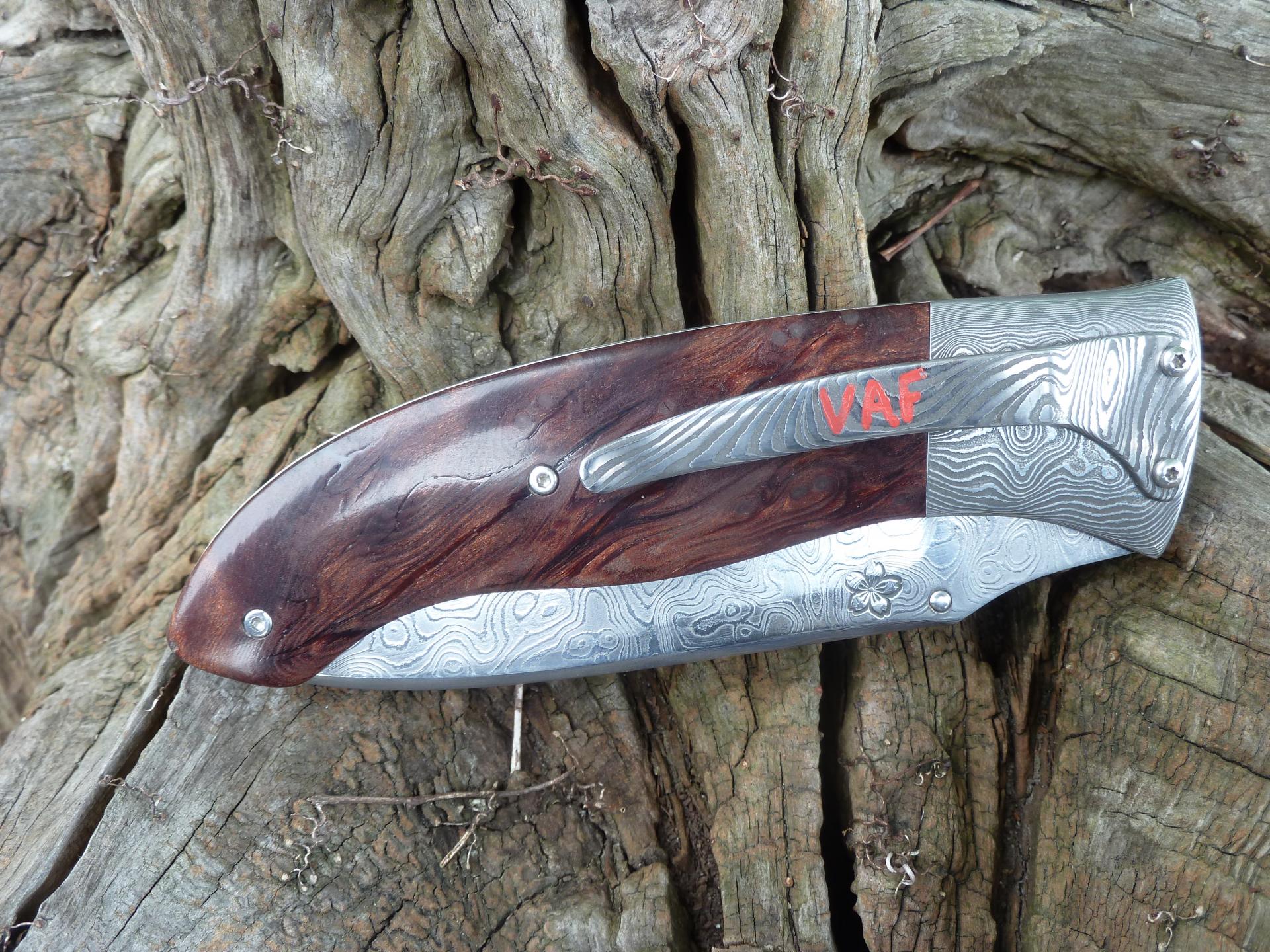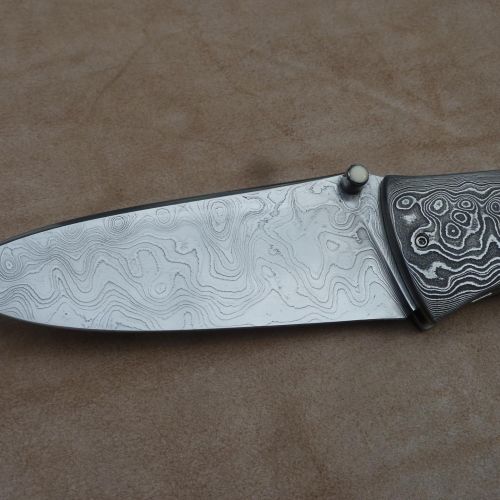 Čepel: divokej damašek cca 200 vrstev, bolstry a klip rovněž z damašku, dřevo Redwod, čepel 100mm Rukojeť: Pouzdro: