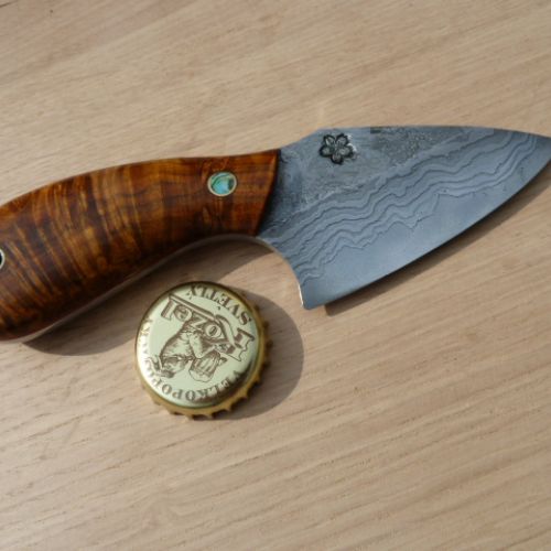 Čepel: divokej damašek cca 2500 vrstev Rukojeť: tvrdé dřevo z filipín, paua, mosazné trubičky a tygří oko Pouzdro: hovězina mořeno