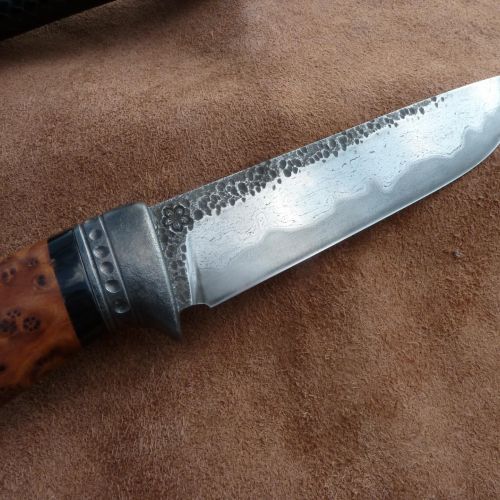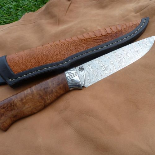 Čepel: damašek cca 100 vrstev Rukojeť: nádor Akátu, mosazné nýty Pouzdro: hovězina potažená hadí kůží