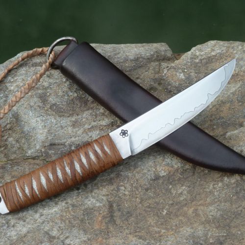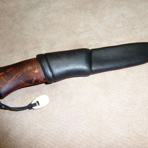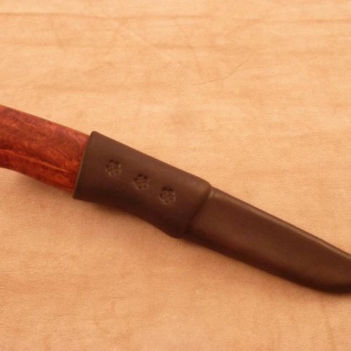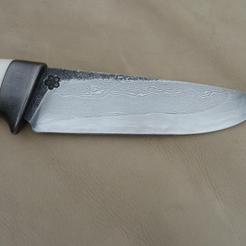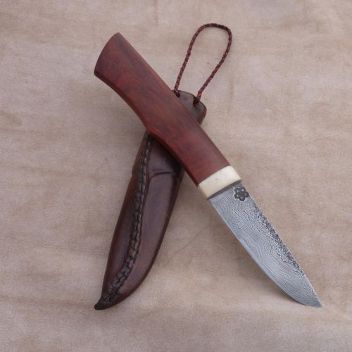 Čepel: damašek jemná kresba na diviko Rukojeť: záštita kousek mokume, hovězí kost, dřevo z Laosu místními nazívané Makaňo Pouzdro: hovězina