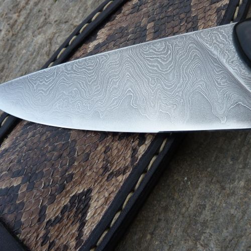 Čepel: torzní damašek s velmi jemnou strukturou Rukojeť: kasejin Pouzdro: hovězina potažená hadí kůží